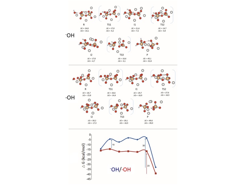 Reaction of [SiO2(OH)-O-SiO3]Na5 system and Gibbs free energy calculation. Reaction of [SiO2(OH)-O-SiO3]Na5 system with OH- and with •OH. Calculated Gibbs free energy profiles for the reaction of [SiO2(OH)-O-SiO3]Na5 model with OH- (blue) and with •OH (red).