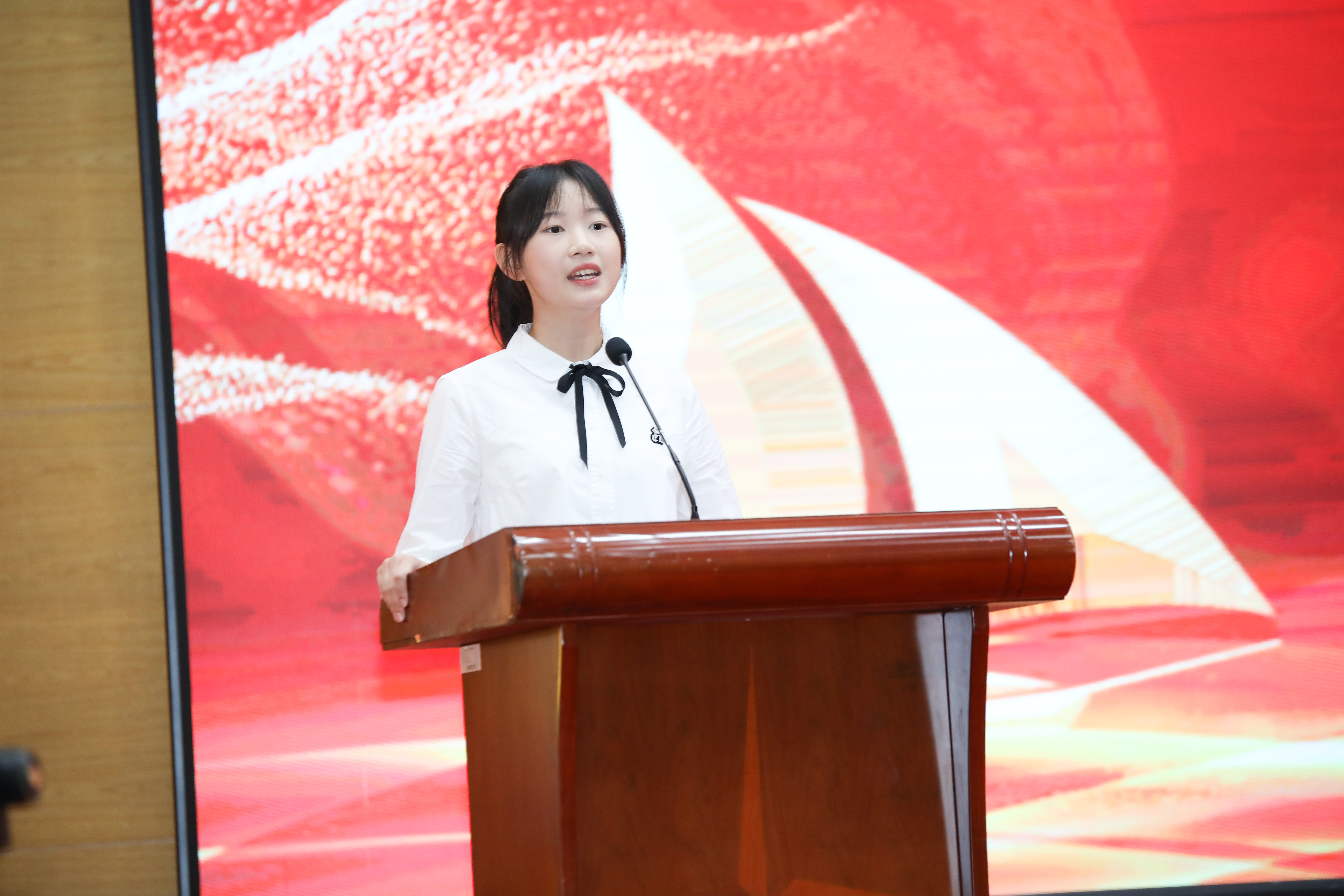 2021级本科生周美杉同学作为学生代表发言。她回顾了高中时的奋斗时光,畅谈了入学以来的感受体会,表达了投身化学科研事业的意愿,发出了强国有我、强校有我、强科技有我的青年之声。