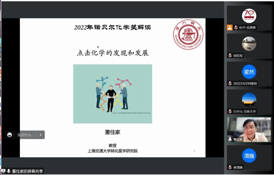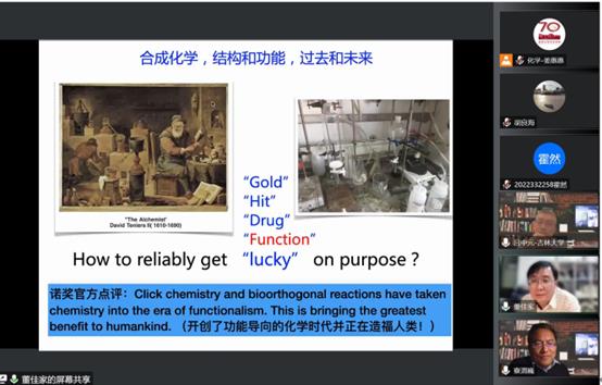 讲座中,董佳家教授围绕点击化学的发现和发展,深入浅出且幽默诙谐地介绍了 “点击化学”——模块化连接砌块分子,实现分子功能的理论本质,并对其开创了功能导向的化学时代进行了详细解读。同时分享了K. Barry Sharpless教授乐于学习、善于发现、勇于探索的科学精神以及Sharpless教授生活工作中的一些有趣的小故事。随后,董佳家教授激励广大学子,希望当代青年学者能够学习发扬老一辈化学家的科学精神,内化于心,外化于行,勇攀学术高峰。在交流互动环节,董佳家教授耐心详细地解答了院内外师生的问题,并对点击化学领域的发展做出了展望,91成人