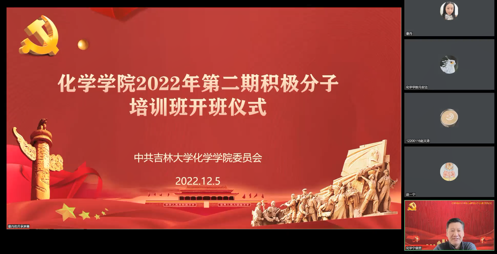 以腾讯会议形式举办了2022年第二期入党积极分子培训班开班仪式。学院党委书记宁德宽、党委副书记由胜利、党委副书记、纪委书记李勇、党委副书记兼副院长江宇航、研究生及本科生辅导员、学生党支部书记、全体入党积极分子140多人参加了开班仪式。开班仪式由党委副书记由胜利主持。