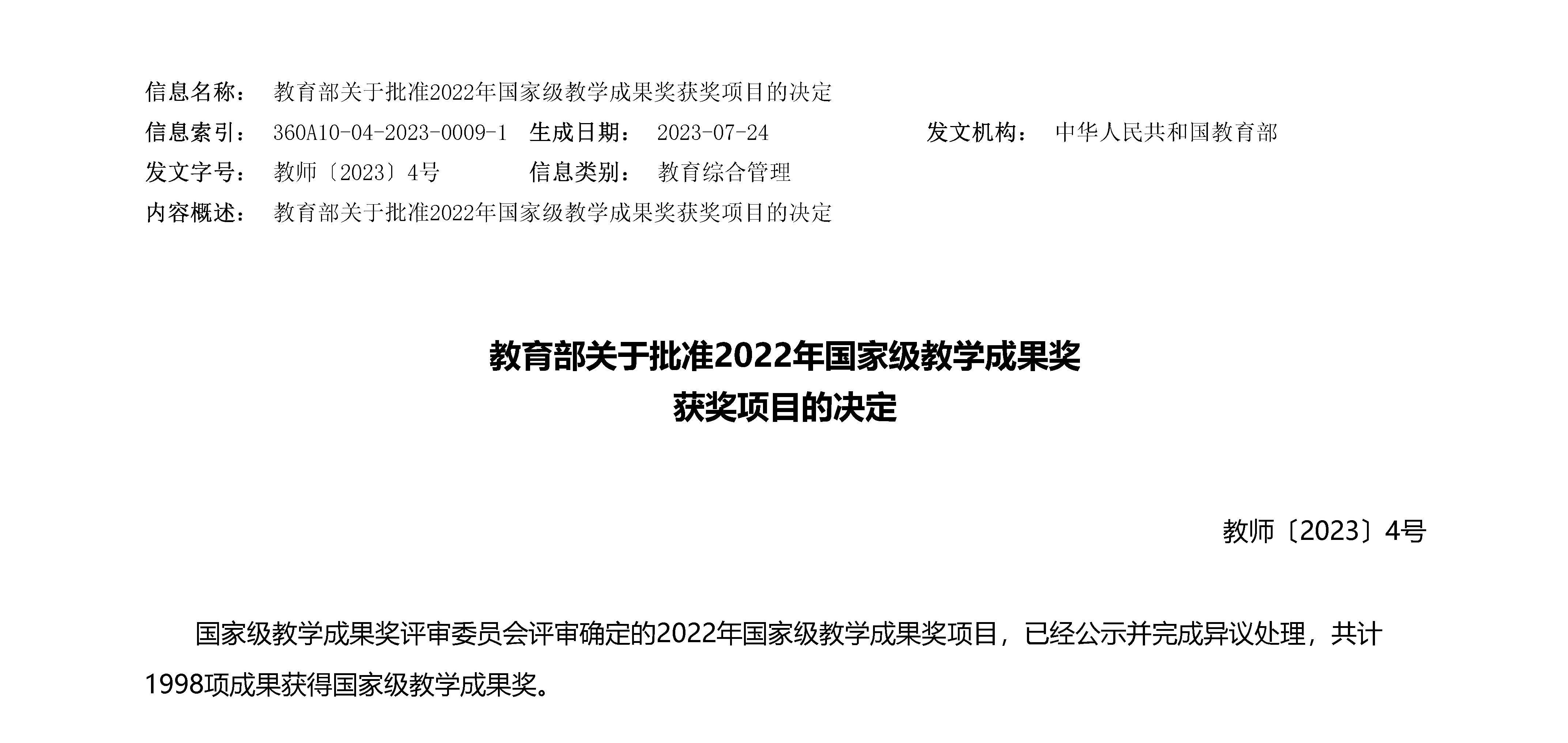 近日,《教育部关于批准2022年国家级教学成果奖获奖项目的决定》(教师〔2023〕4号)公布。91成人