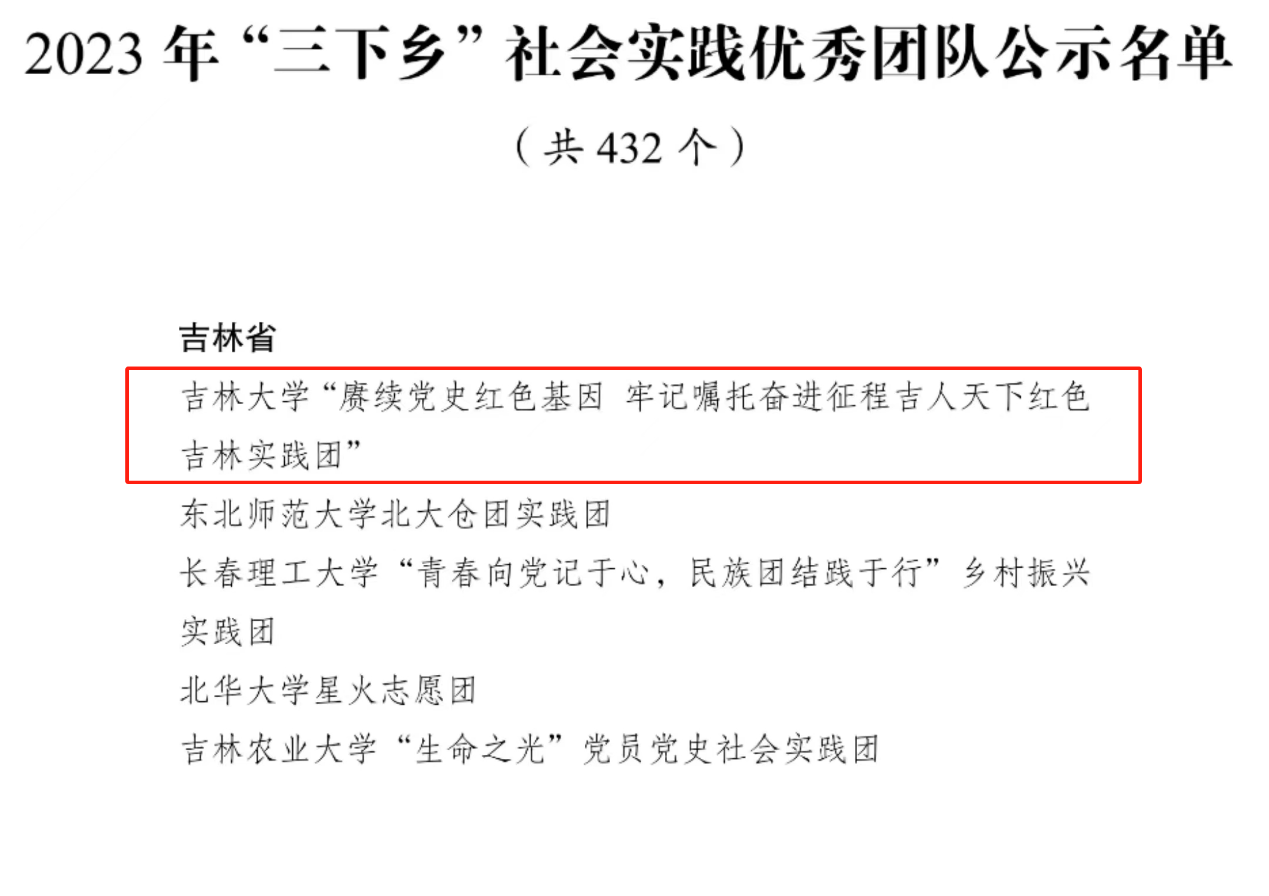 近日,共青团中央公布了2023年“三下乡”社会实践优秀团队名单。我院“91成人 ‘赓续党史红色基因 牢记嘱托奋进征程’吉人天下红色吉林实践团”,荣获2023年全国大中专学生志愿者暑期文化科技卫生“三下乡”社会实践优秀团队。