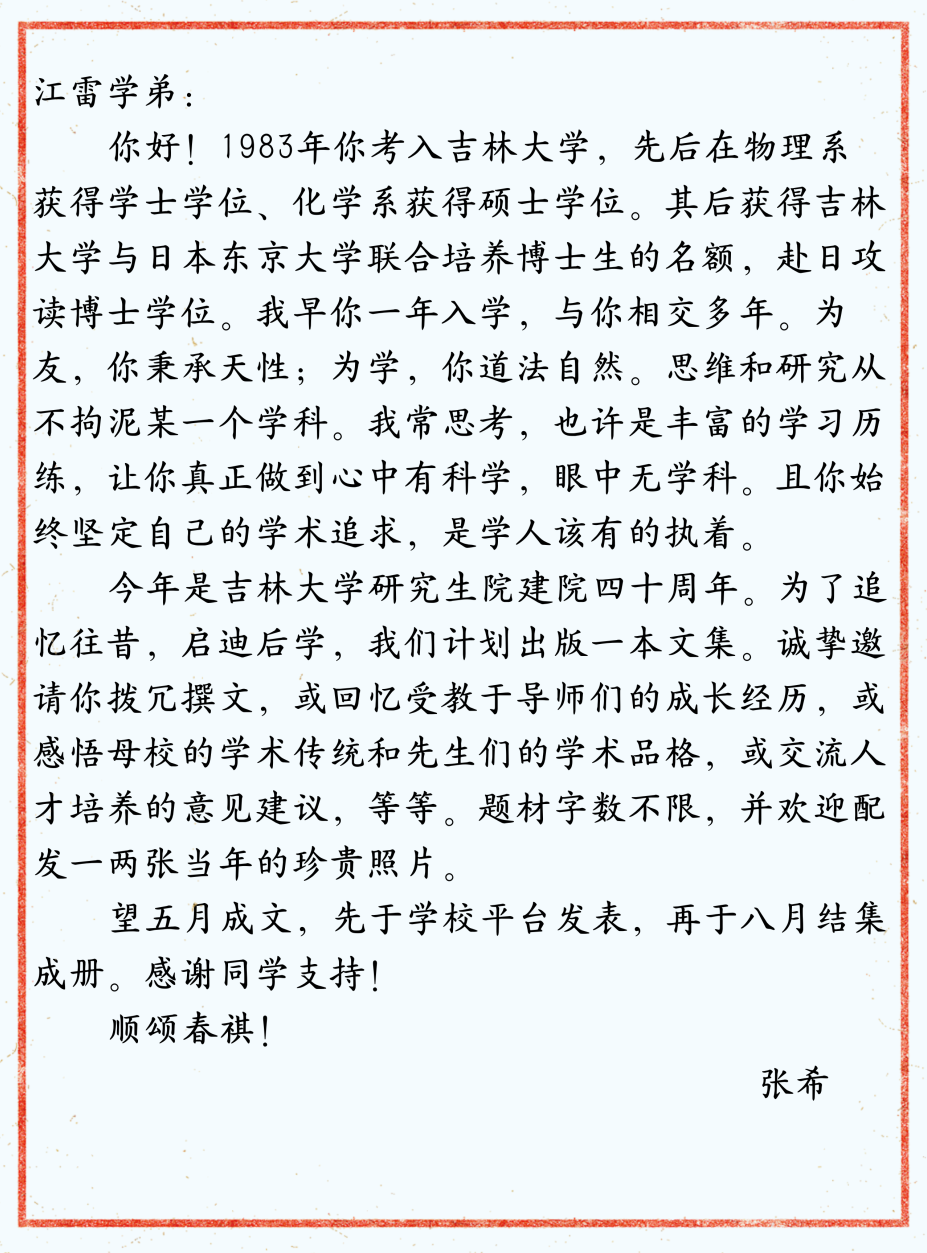 收到校长情真意切的邀请函,记忆已经飞回那熟悉的校园,我欣然应约,共书《闻雁集》。吉大于我,是生地、是乐园、是母校。这里有父母、有恩师、有同学、有故事。诚如校长所述,我学术道路上的成绩,离不开对“道法自然”科学研究的挚爱和对学科交叉的执念。值此研究生院建院四十周年之际,我想留下我的成长故事,与“后辈”们共勉。成功人生的旅程往往是这样的:“不要总想着第一步就踏上人生的金砖,只管大胆地跨出。当你终于踏上属于你的那块金砖的时候,回首一看,原来步步都是金砖!”我愿用这“一路金砖”与你们分享,如果能够给你们的工作和生活以启发,那将是作为“前辈”的最大欣慰。