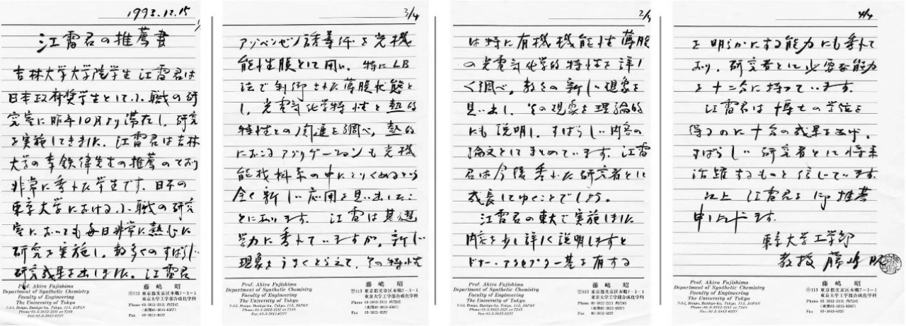 当时,很多同学到日本后,都选择放弃联合培养,重新考试进入日本的博士课程,去拿“东洋”博士学位。藤岛先生也问我:“是否也加入东大的博士课程。”我笑着说:“我博士论文都快写完了。”他很意外!说:“那就赶紧回吉大答辩吧,回来做博后!”随即用毛笔书写了同意我提前答辩的“推荐书”。我得以提前一年获得吉大化学系的博士学位,与我同期留日的同学相比,“抢回”了4-5年。我博后期间的研究方向是光诱导分子晶体表面相变,后被藤岛先生推荐到神奈川科学技术研究院领衔“光诱导界面相变调控”项目组。