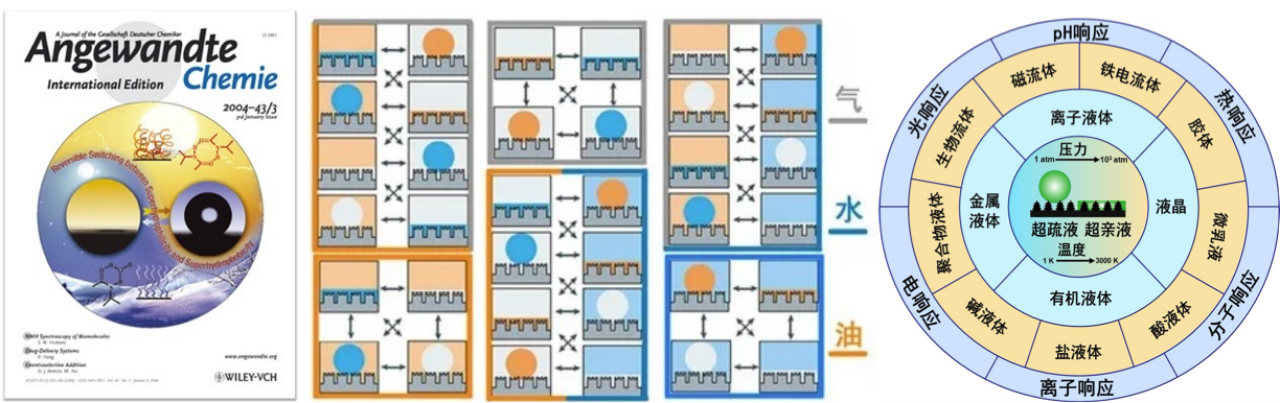 图7 左图:阴阳二元协同超级界面开关在《德国应用化学》封面报道;中图:64个组合方案的超浸润界面材料体系;右图:以及拓展到12类液体及极端环境。