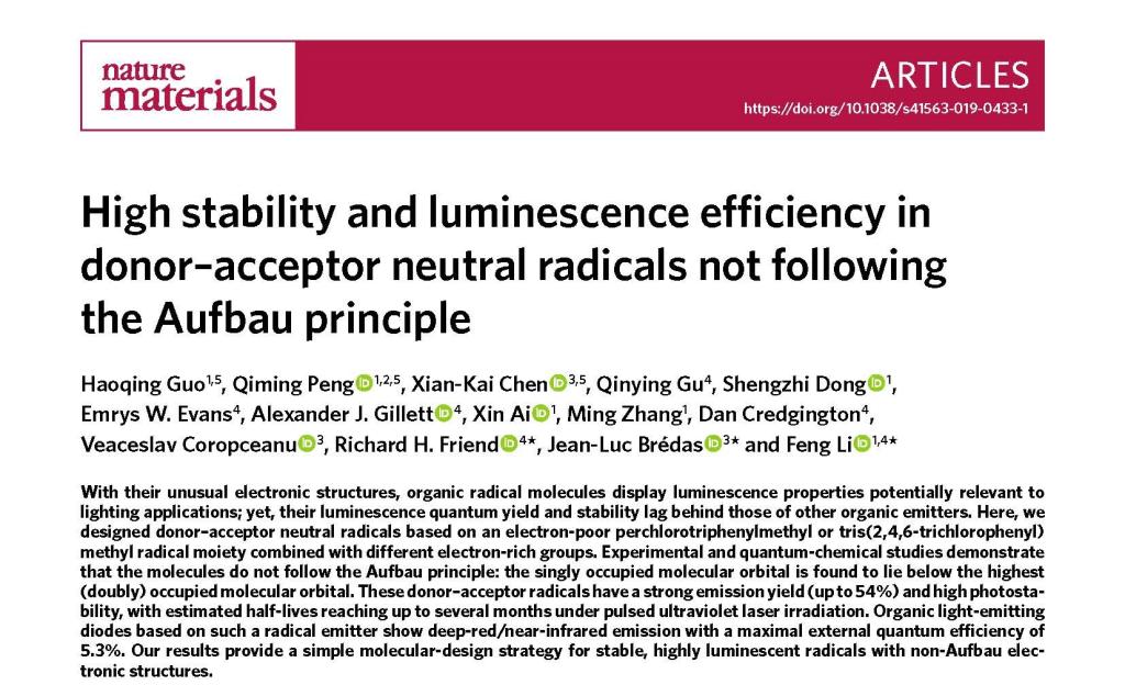 超分子结构与材料国家重点实验室李峰教授团队、佐治亚理工学院Jean-Luc Brédas教授团队和剑桥大学卡文迪许实验室Richard H. Friend教授团队的合作研究论文“不遵循构造原理的高稳定高发光效率给受体结构中性自由基”(High stability and luminescence efficiency in donor–acceptor neutral radicals not following the Aufbau principle, Nature Materials, 2019, DOI:10.1038/s41563-019-0433-1),91成人