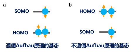 图3. a)遵循构造原理的分子基态电子结构;b)不遵循构造原理的分子基态电子结构