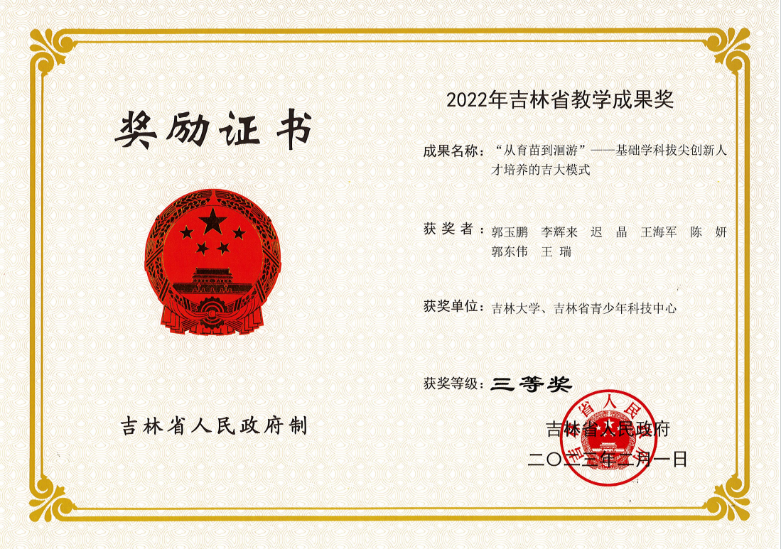 2023年,无党派人士郭玉鹏教授获吉林省教学成果奖三等奖。