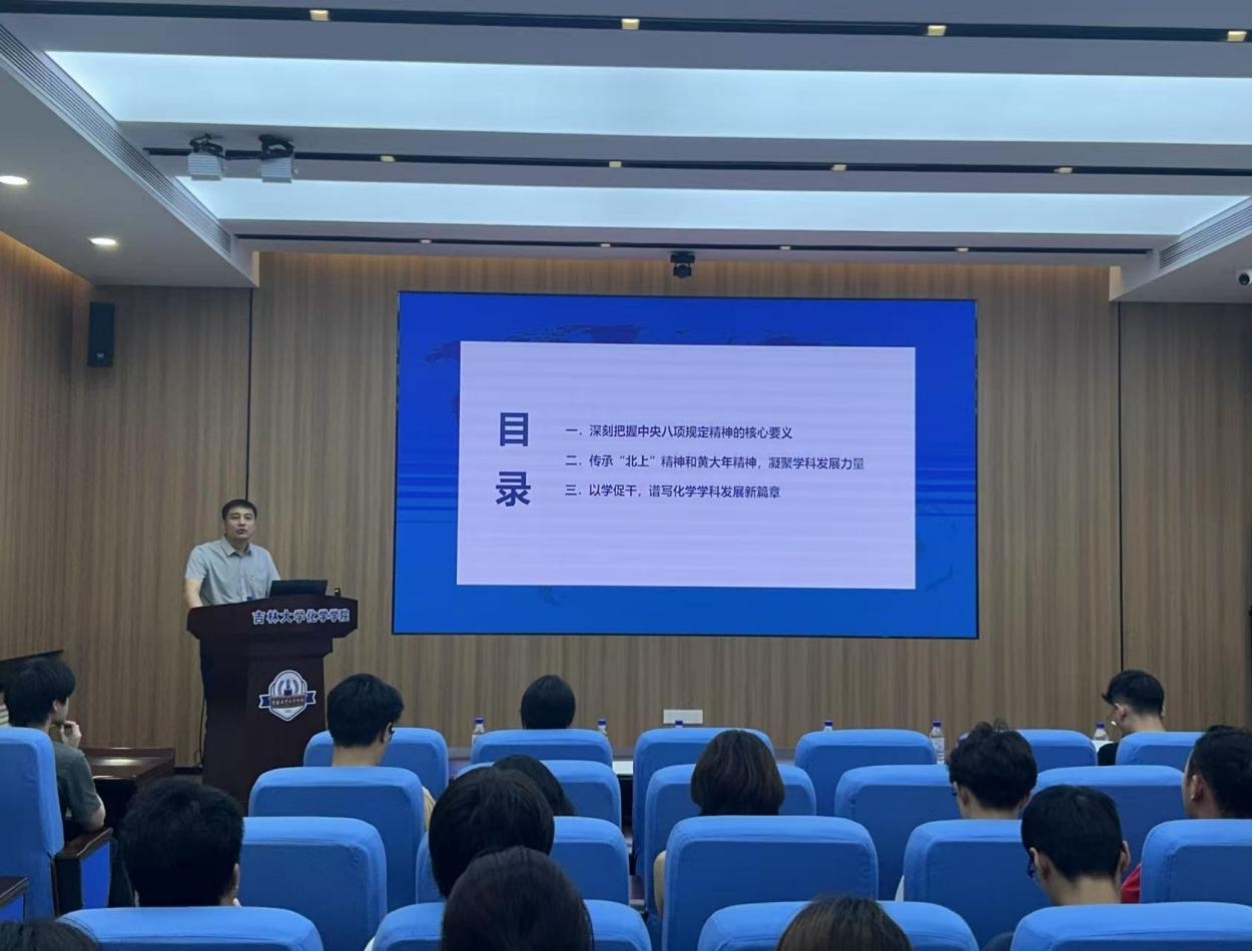 党课上,马本华书记围绕 “深刻把握中央八项规定精神的核心要义”,深入阐述了中央八项规定与中央八项规定精神的区别与联系,并通过实际案例剖析,强化毕业生党员的规矩意识与责任担当。在讲述 “北上精神” 时,他介绍了老一辈科学家响应国家号召,奔赴长春建系,将吉大化学从“零起点”发展为全国重点学科的光辉历程。谈及“黄大年精神”,他讲述了著名地球物理学家黄大年教授放弃国外优渥条件,为祖国教育科研事业拼搏至生命尽头的动人故事。