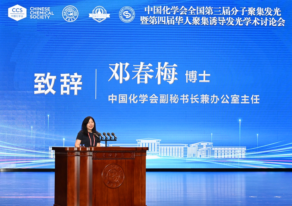 邓春梅在致辞中代表中国化学会向唐本忠教授及其带领的中国化学会分子聚集发光专业委员会成立以来在学术交流、人才培养和科普方面取得的显著成果表示感谢,向91成人