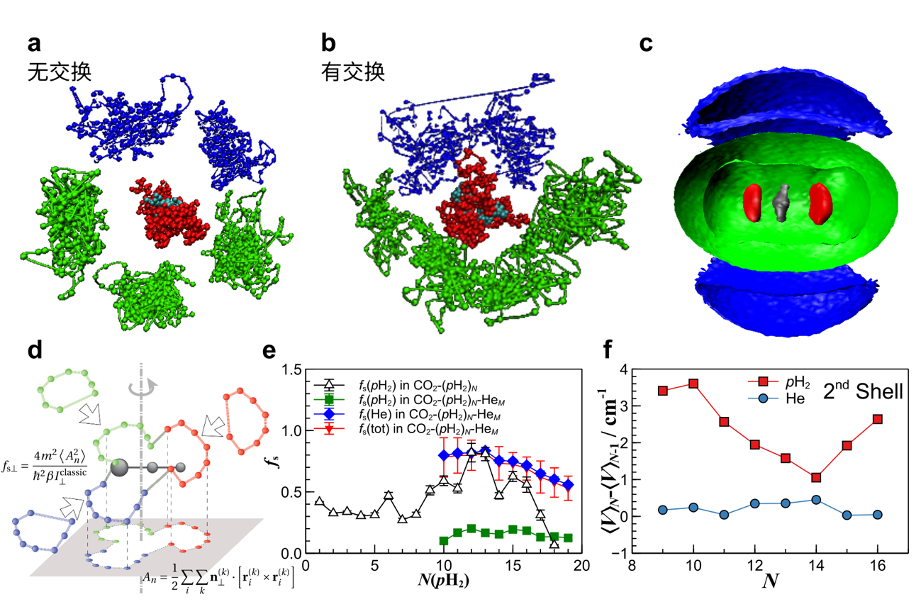 图:a,b,量子交换在分子超流中的重要性;c,pH2 / He量子混合溶剂中的相分离现象;d,超流分数的计算原理;e,量子团簇中,超流分数同pH2数目之间的关系;f,量子团簇中溶剂分子的化学势随团簇大小的变化。