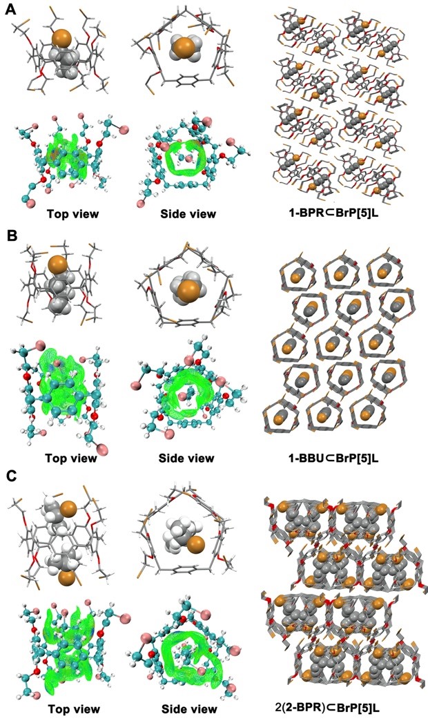 在前期的工作中,该课题组设计合成了一例“骨架精简版的”甲基柱[5]芳烃衍生物,即精巧型甲基柱[5]芳烃(permethylated leggero pillar[5]arene),并进一步在固相条件下实现了对其分子堆积从无序到有序(无定形态至晶态)的精准调控(J. Am. Chem. Soc.2021,143, 20395)。在此研究工作基础之上,该课题组成功设计并合成了一种全溴乙基取代的精巧型柱[5]芳烃衍生物(perbromoethylated leggero pillar[5]arene,简称为BrP[5]L),随后通过客体诱导的方式实现了对其固相分子堆积从无序到有序的精准调控并同时利用该过程实现了对卤代烃位置异构体的高精准式吸附与分离应用(图一)。实验结果表明,无定形且无孔的BrP[5]L粉末可以通过固相主客体相互作用来吸附多种溴代烷烃蒸汽(1-溴丙烷、2-溴丙烷、1-溴丁烷以及2-溴丁烷),进而构筑得到多种溴代烷络合形式的有序超分子组装体。同时,作者发现1-溴代烷和2-溴代烷与BrP[5]L之间所形成的固相主客体络合结构具有不同的键合模式以及热力学稳定性差异,这使得无定形BrP[5]L粉末在1-/2-溴代烷烃位置异构体的吸附分离方面展现出了巨大的应用潜力。