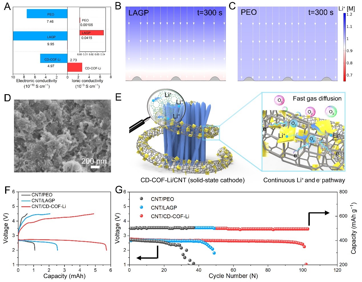 图:a) CD-COF-Li、LAGP和PEO的电子电导率和离子电导率值;b-c)有限元模拟;d)扫描电镜图片;e)固态正极的设计原理图;f)放电容量测试;g)循环寿命测试。