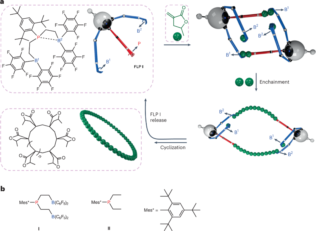 图1 a, c-PMMBL形成示意图。FLP I与单体反应形成环状二聚体模板,然后成对的单体嵌入以扩环,最终使催化剂I环化和再生。酸性B位点为蓝色,标记为B1和B2,碱性P位点为红色,单体为绿色。b,本工作中使用的三官能催化剂B-P-B(I)和单官能P(II)的结构。