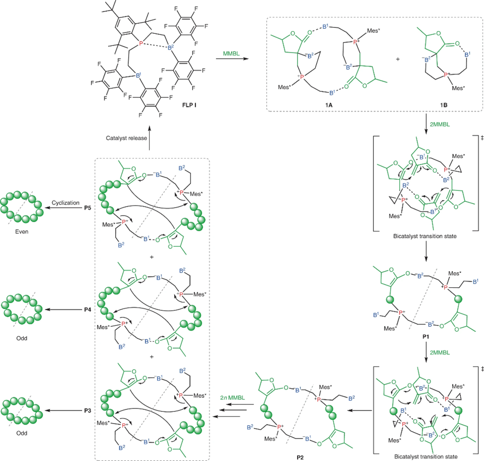 图5 c-PMMBL合成中的关键基本步骤,包括通过将催化剂以相同的化学计量加入到MMBL中形成环状模板1A和1B,环状模板1A、1B中的后续单体配位/活化和插入事件以及双催化剂过渡状态,通过在双催化剂过渡状态和环闭合的两个LP催化剂位点处同时重复成对单体嵌段进行环膨胀,以产生具有奇数和偶数MMBL单元的环状聚合物并再生催化剂。