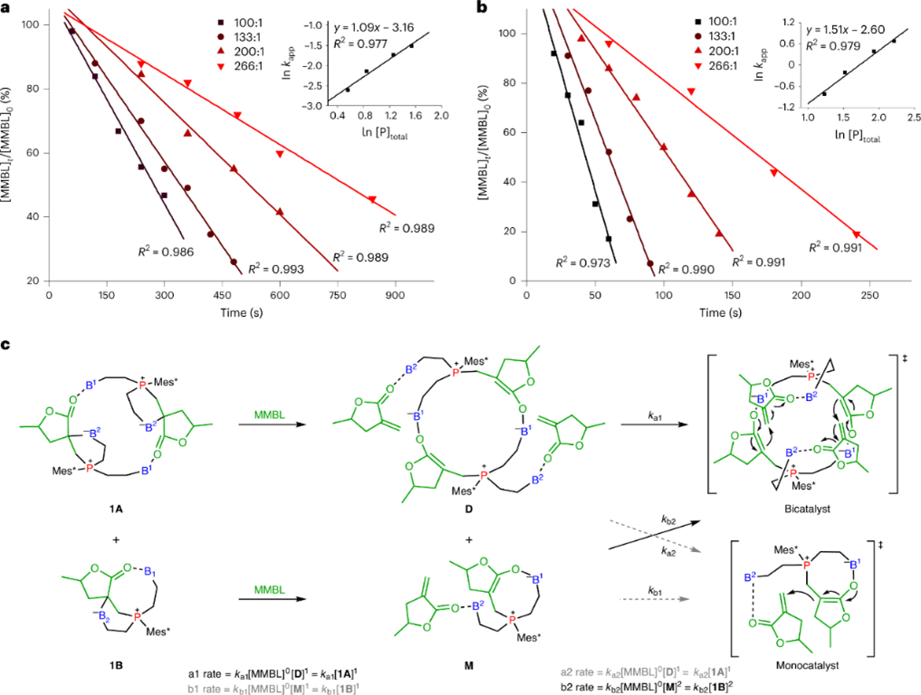 对聚合过程的研究表明,FLP1与MMBL的化学剂量反应生成了约等摩尔比的环状双分子产物1A和环状单分子产物1B(图3a),其中1A得到了晶体结构的明确表征(图3b)。单独采用1A与1B的混合物进行聚合试验,得到的聚合物结构完全相同。作者进一步对动力学进行研究(图4a,b)。首先单独使用1A的动力学显示(图4a),反应相对于1A表现为一级动力学,说明1A聚合反应式按照ka1的途径进行。而使用1A与1B的混合物催化聚合时,相对于催化剂中Lewis碱的总量动力学显示为1.5级(图4b),这说明聚合过程中1B必须采用kb2的途径进行才能实现,也就是说虽然催化剂转化成了1A与1B的混合物,但两者在聚合时都要以双分子协同方式进行链增长。