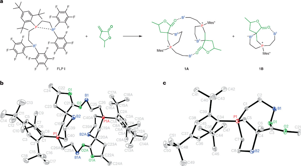 图3 a,FLP I与MMBL的反应分别提供环状双分子和单分子中间体1A和1B。为了清楚起见,这两个B原子被指定为B1和B2。b,环状双分子中间体1A的X射线晶体结构。c, 环状单分子中间体2B(由FLP I和MMA的反应生成)的X射线晶体结构,其是环状单分子1B的模型。