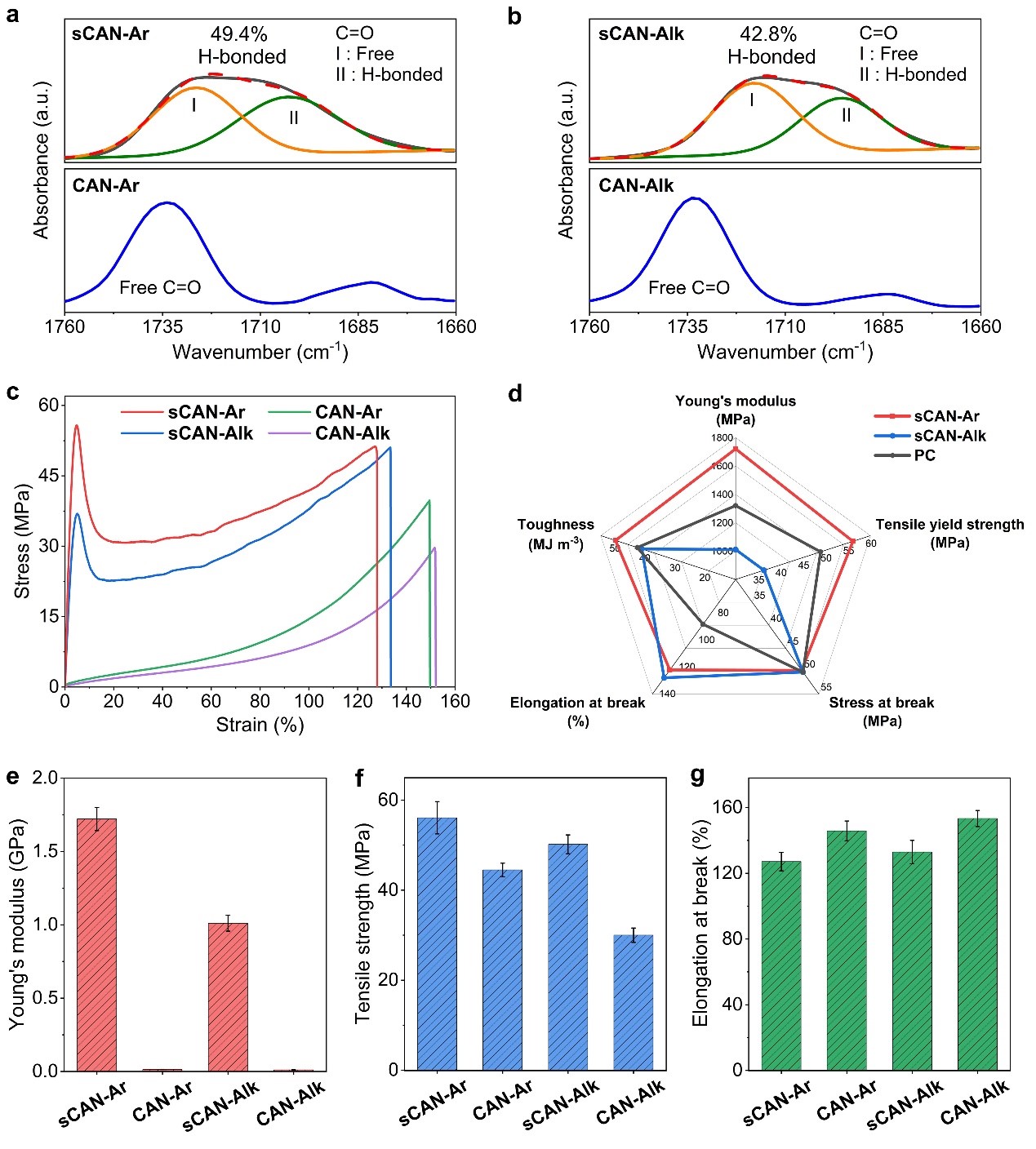 图2: a-c) Supra-CANs和CANs聚合物的红外图谱(羰基伸缩振动区)(a,b) 和应力-应变曲线 (c);d) Supra-CANs聚合物与商业化聚碳酸酯塑料(PC)的力学性能对比;e-g) Supra-CANs和CANs聚合物的杨氏模量(e)、拉伸强度(f)、断裂伸长率(g)的对比图。