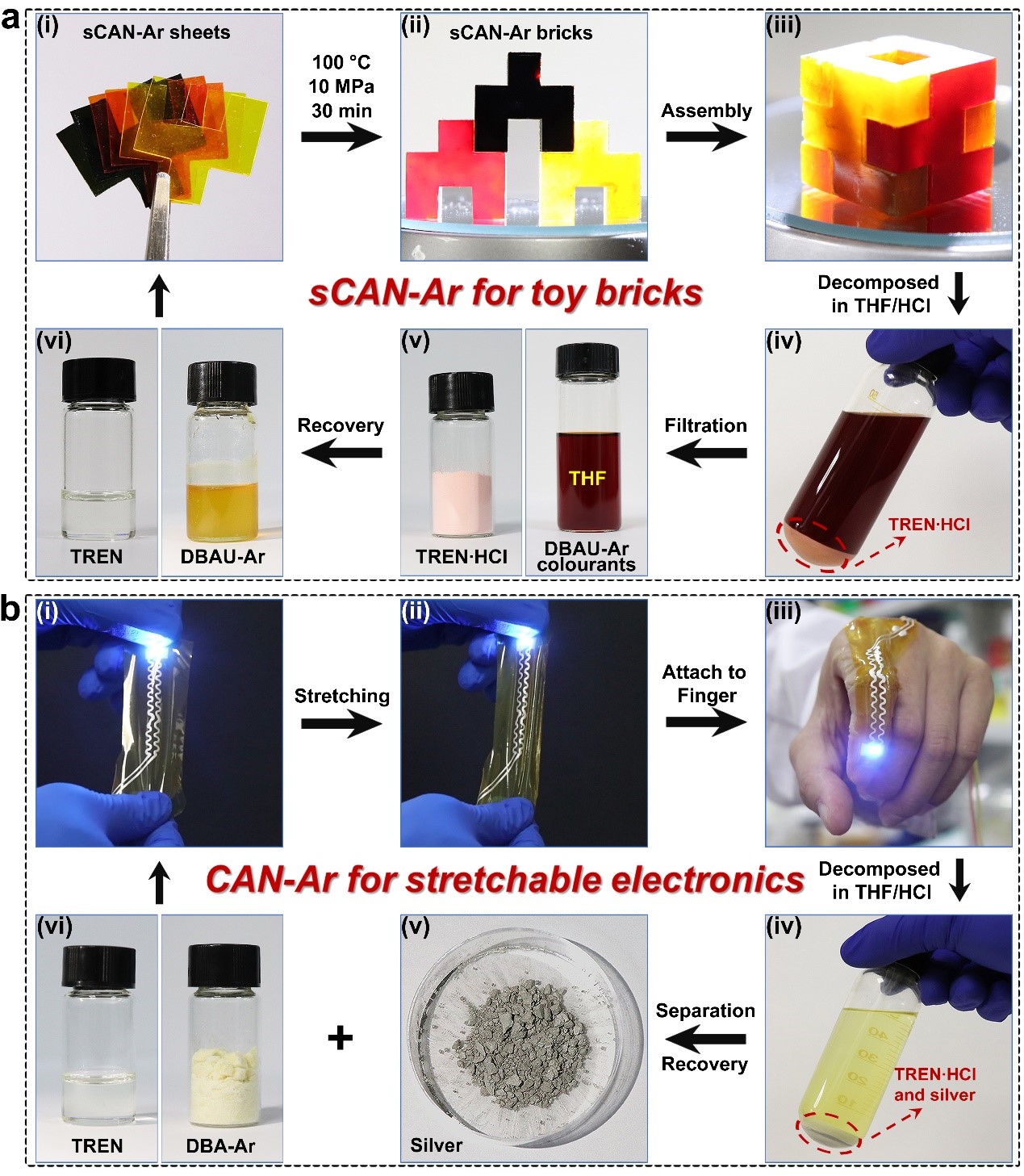 图5: a) Supra-CAN聚合物制备彩色积木块的应用展示及其闭环回收过程;b) CAN聚合物制备柔性电子器件的应用展示及其闭环回收过程。