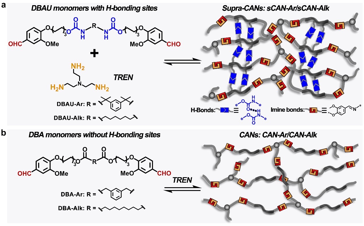 图1: a,b) Supra-CANs (a) 和CANs (b) 聚合物的合成示意图。