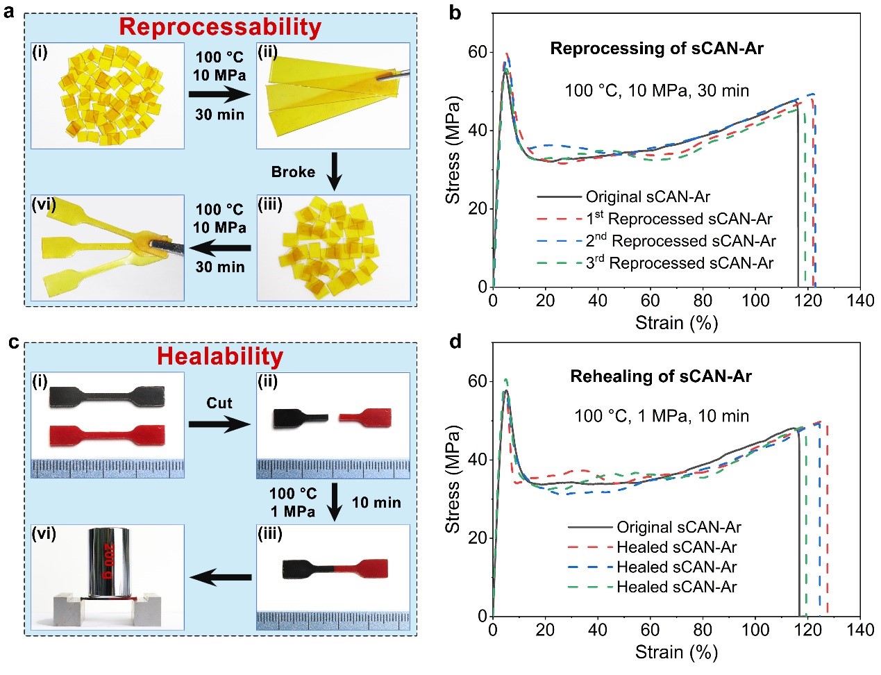 图4: a,c) Supra-CAN聚合物的重塑加工 (a) 和修复 (b) 展示;b,d) supra-CAN聚合物的原始,多次重塑 (b) 和修复 (d) 后的应力-应变曲线。
