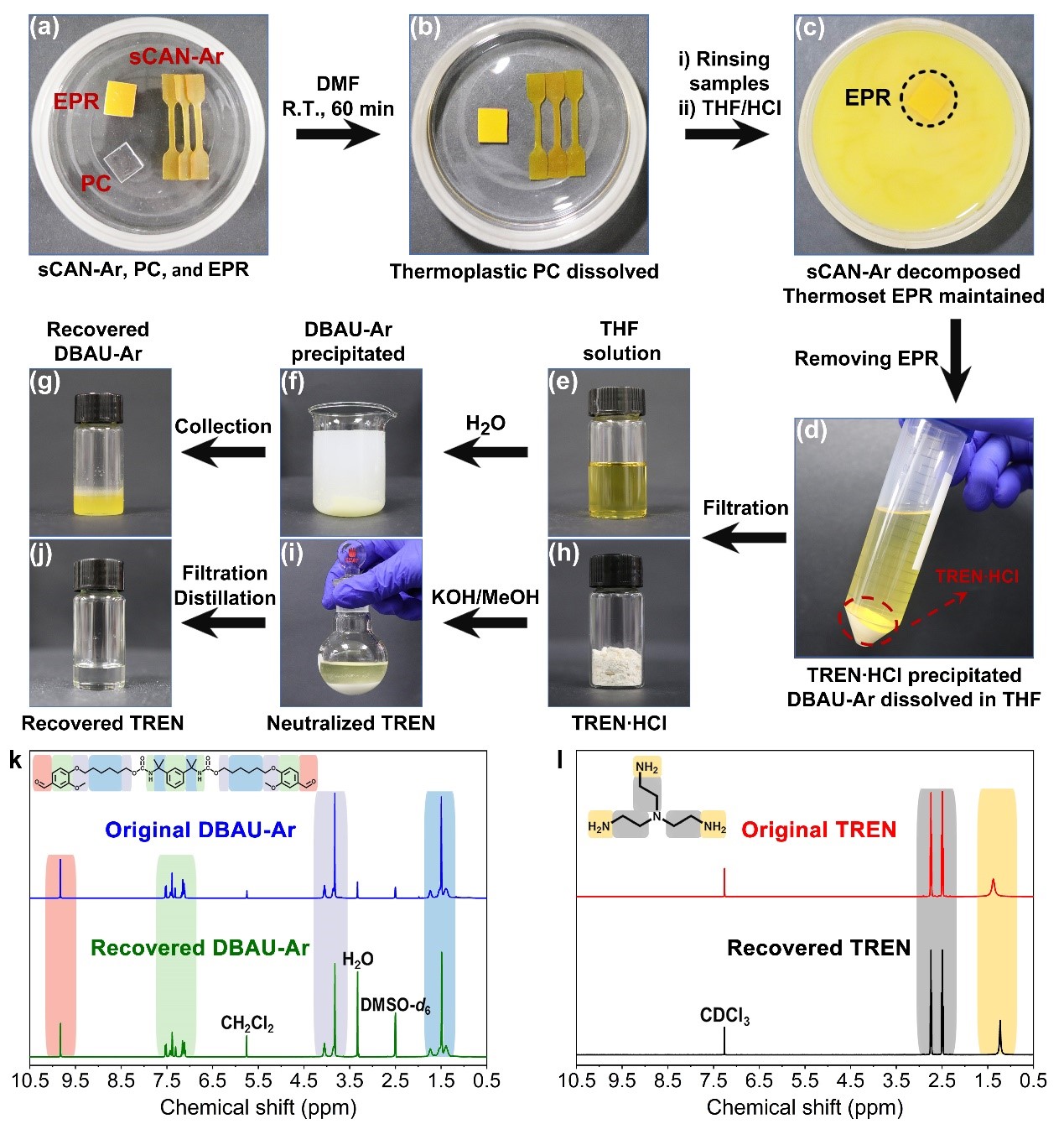 图3: a-j) Supra-CAN聚合物的室温解聚和单体回收过程;k,l) 回收单体和原始单体的核磁图谱。