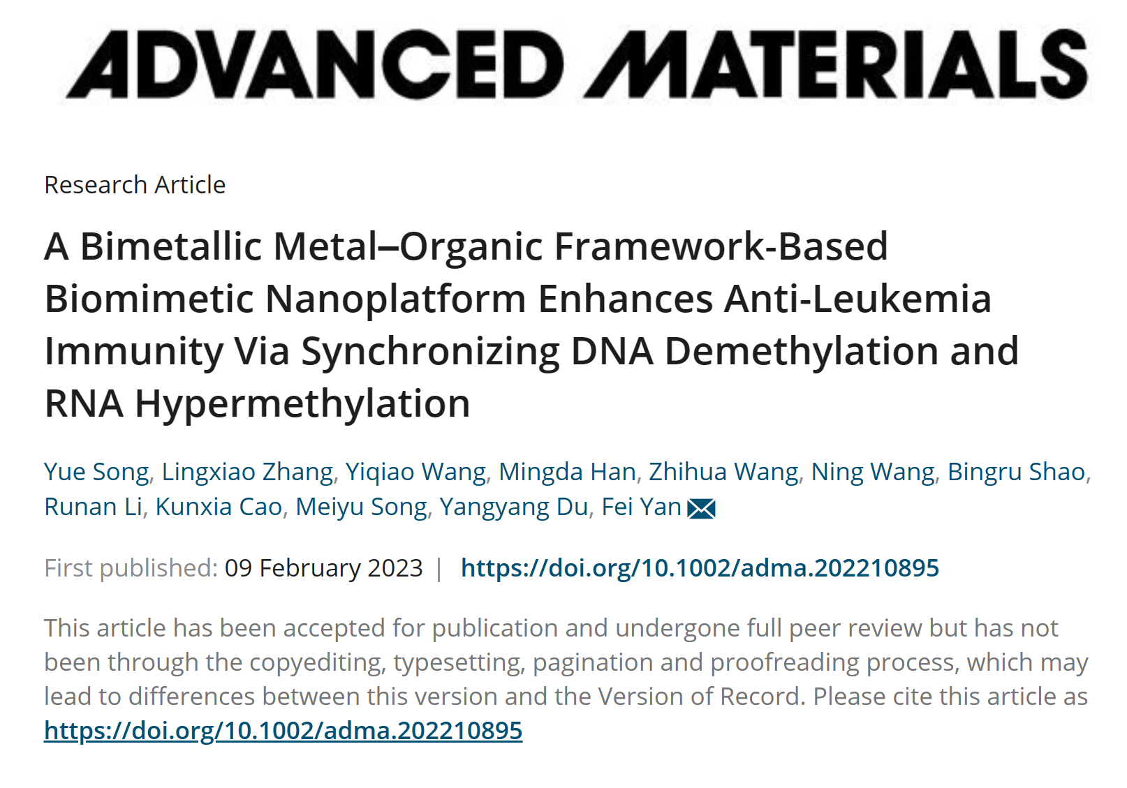 无机合成与制备化学国家重点实验室闫飞课题组提出一种纳米表观治疗新策略,并以“A Bimetallic Metal–Organic Framework-Based Biomimetic Nanoplatform Enhances Anti-Leukemia Immunity via Synchronizing DNA Demethylation and RNA Hypermethylation”为题发表在Advanced Materials上。91成人