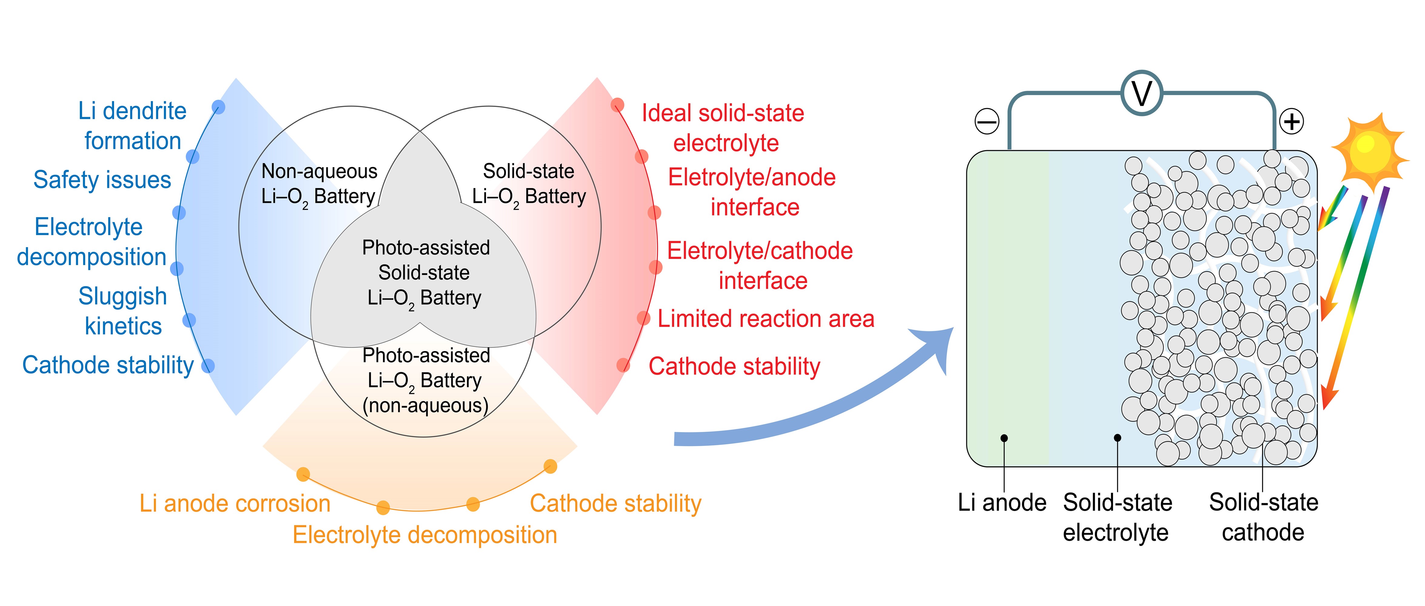 徐吉静课题组前期研究证明了利用太阳能构筑光辅助锂空气电池是提升正极反应动力学的有效策略(Adv. Mater. 2022, 34, 2104792、Adv. Mater. 2022, 34, 2107826、J. Am. Chem. Soc. 2021, 143, 14253、Angew. Chem. Int. Ed. 2020, 59, 19518、Adv. Mater. 2020, 32, 1907098、Adv. Energy Mater. 2022, 12, 2103097、ACS Nano 2022, 16, 12364)。但光辅助策略在增加正极催化活性的同时也会加剧电解液分解和锂负极腐蚀,导致电池的快速失效。同时该课题组的研究也证明了采用高机械强度和安全性的固态电解质取代液态电解质,可以有效避免不可逆的电解液分解和负极锂枝晶生长,从而提高电池的安全性和循环寿命(Nature 2021, 592, 551、J. Am. Chem. Soc. 2023, 145, 5718、Chem 2023, 9, 394、Matter 2023, 6, 142、Nat. Commun. 2020, 11, 2191、Adv. Mater. 2020, 32, 2002559、Adv. Funct. Mater. 2022, 32, 2113235、ACS Nano 2020, 14, 3281)。因此,固态电解质与光辅助锂空气电池的结合将发挥光辅助策略和固态电池的双重优势,有望同时解决电池的正极动力学缓慢、电解液分解、负极枝晶等关键难题(图1)。