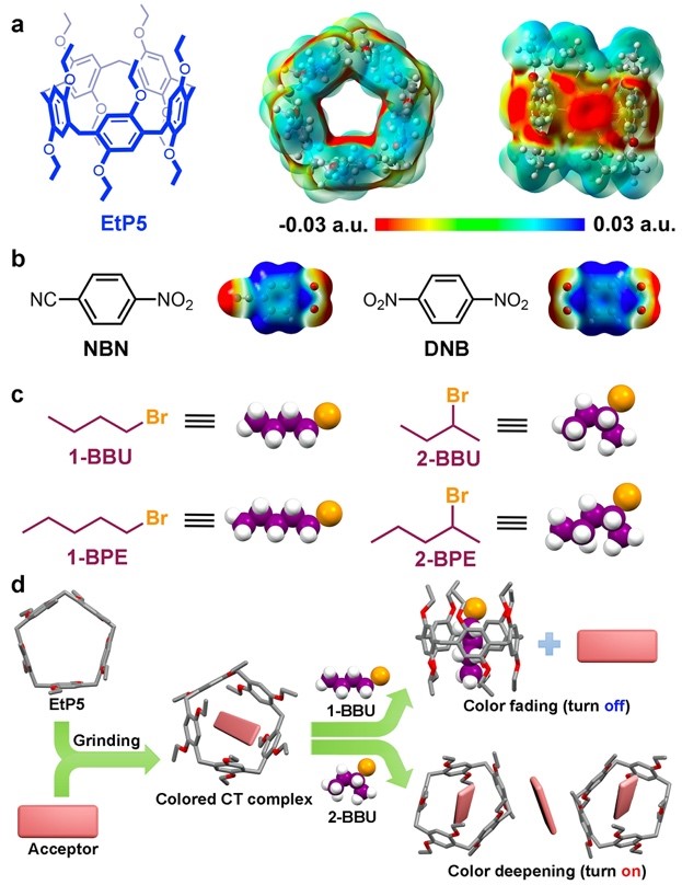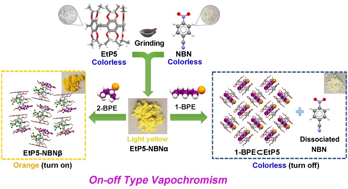 杨英威课题组通过重建(开启)和破坏(关闭)乙基柱[5]芳烃(EtP5)和缺电子芳香客体(包括4-硝基苯甲腈(NBN)和1,4-二硝基苯(DNB))之间的CT相互作用构筑得到一类亚稳态的开关型汽致变色共晶材料。研究发现,无色的EtP5粉末可直接通过研磨的方法与NBN(无色)和DNB(棕色)在固相状态下相结合形成亚稳态的CT复合物(EtP5-NBN和EtP5-DNB)。由于分子间电荷转移相互作用的存在,EtP5-NBN和EtP5-DNB粉末分别呈现淡黄色和橙红色。有趣的是,当吸附1-溴丁烷(1-BBU)和1-溴戊烷(1-BPE)的蒸汽时,这些粉末中的CT相互作用会被破坏,并伴随颜色的褪去,而在暴露于2-溴丁烷(2-BBU)和2-溴戊烷(2-BPE)的蒸汽后,这些粉末的颜色会明显加深,整体呈现出开关式的汽致变色现象。单晶和粉末X射线衍射分析表明,颜色褪去和加深分别归因于1-溴代烷异构体的竞争性主客体结合,以及2-溴代烷异构体引发的固相分子运动(晶相重构)以形成高度有序的D-A结构,其中EtP5的动态分子间相互作用和选择性分子识别在决定组装体CT状态和所得晶相中分子的排列与堆积方面起着关键作用。