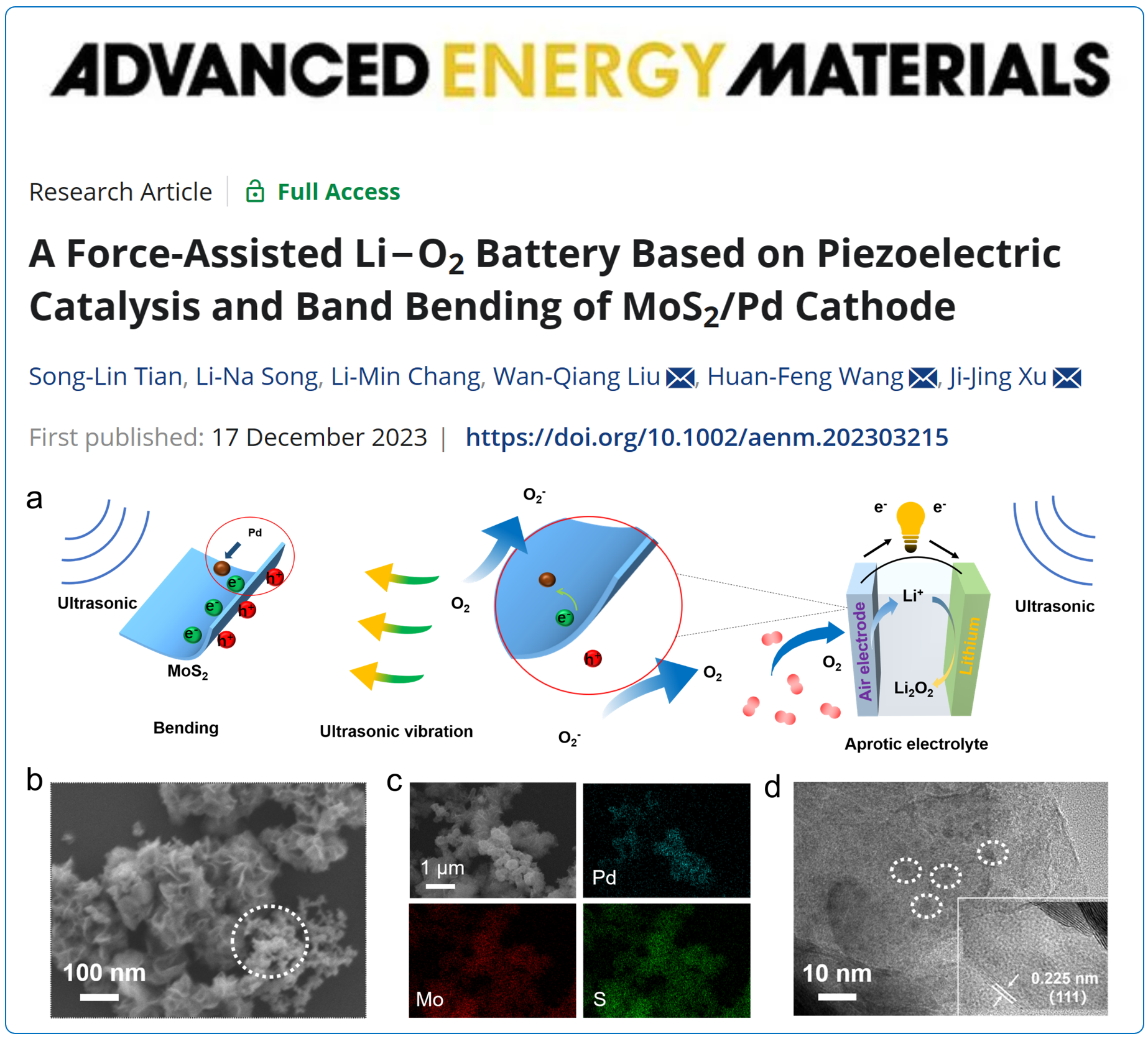 论文详情:Song-Lin Tian, Li-Na Song, Li-Min Chang, Wan-Qiang Liu*, Huan-Feng Wang*, and Ji-Jing Xu*, A Forced-Assisted Li−O2Battery Based on Piezoelectric Catalysis and Band Bending of MoS2/Pd Cathode,Adv. Energy Mater., 2023, 2303215.