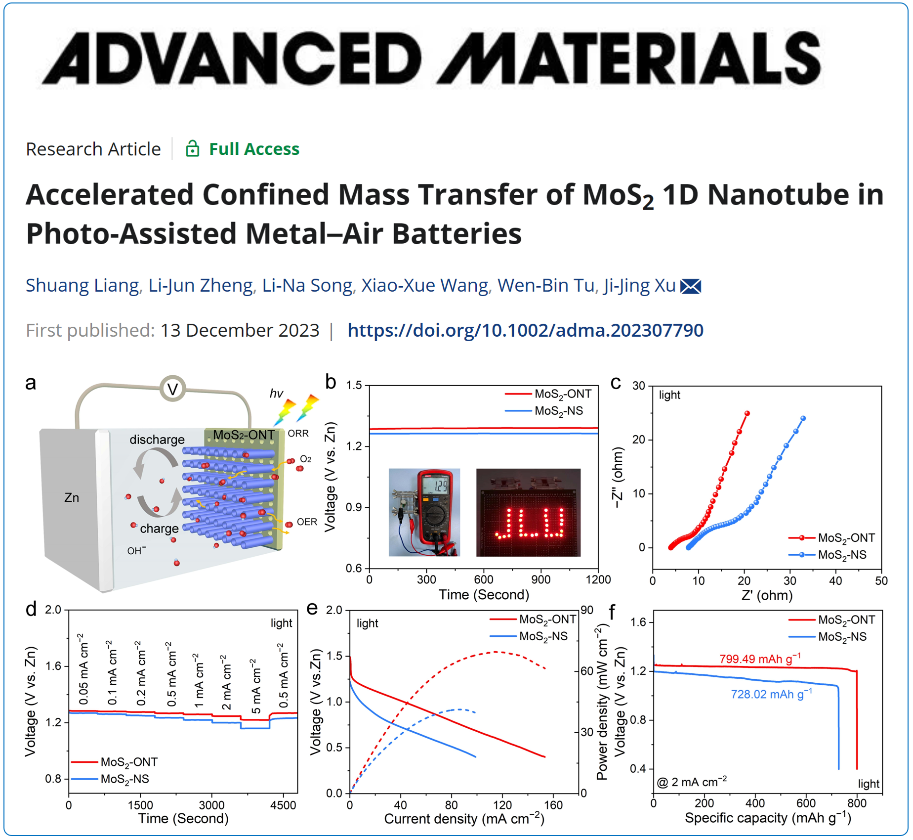 论文详情:Shuang Liang, Li-Jun Zheng, Li-Na Song, Xiao-Xue Wang, Wen-Bin Tu, and Ji-Jing Xu*, Accelerated Confined Mass Transfer of MoS21d Nanotube in Photo-Assisted Metal−Air Batteries, Adv. Mater., 2023, 2307790.