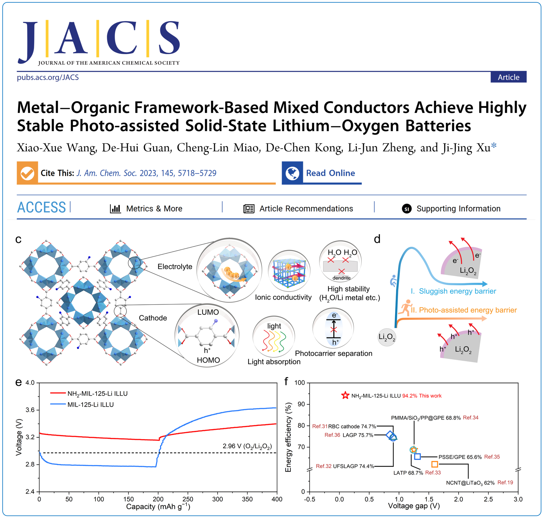论文详情:Xiao-Xue Wang, De-Hui Guan, Cheng-Lin Miao, De-Chen Kong, Li-Jun Zheng, and Ji-Jing Xu*, Metal−Organic Framework-Based Mixed Conductors Achieve Highly Stable Photo-assisted Solid-State Lithium−Oxygen Batteries,J. Am. Chem. Soc., 2023, 145, 5718–5729.