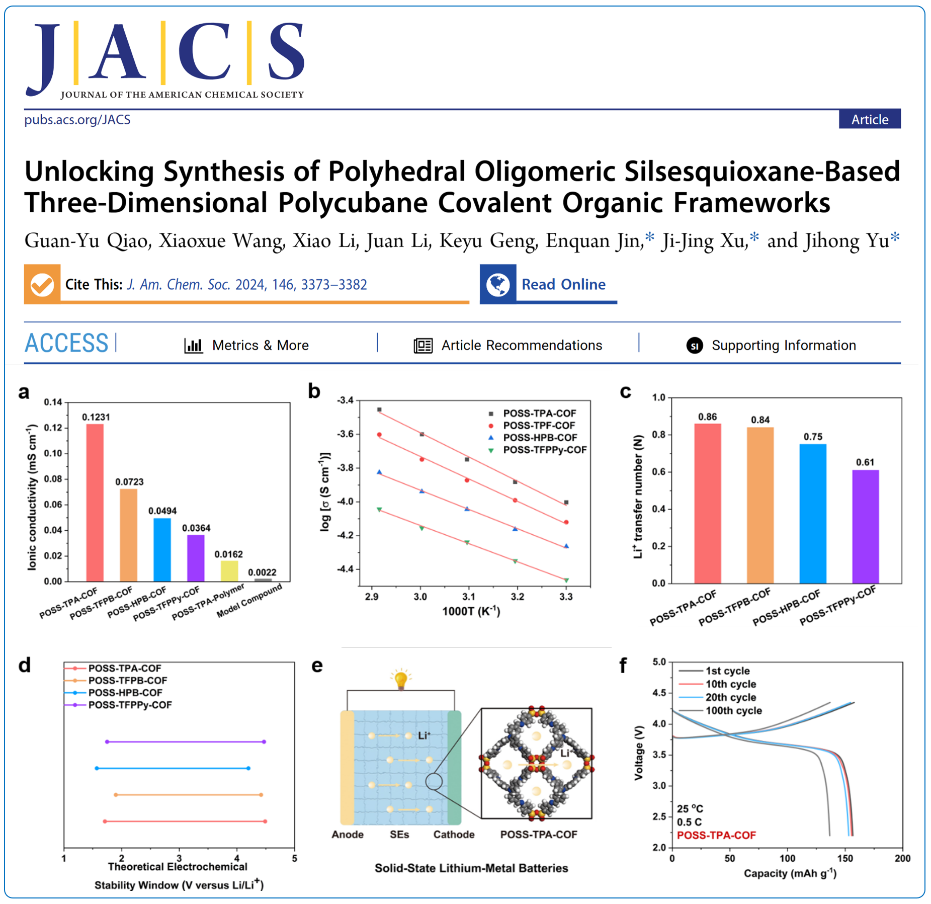 固态锂电池具备能量密度更高、不可燃、不挥发、耐高温等特性,已经成为学术界和产业界争相研发的热点。固态电解质是固态锂电池的核心材料,电解质很大程度上决定了固态锂电池的各项性能参数,如能量密度、安全性能、高低温性能以及循环寿命。目前经典的固态电解质,如氧化物、硫化物、卤化物、聚合物等,由于其稳定性不足还很难满足固态锂电池在实用场景中运行的要求。发展一种兼具高环境适应性和优异电化学性能的新型固体电解质材料是十分迫切的。该工作选择具有Oh对称构型的多面体低聚硅氧烷(POSS)作为构筑单元,设计合成了四种分别具有“the”和scu拓扑结构的新型有机-无机杂化三维(3D)共价有机框架(COFs)。POSS基COFs的杂化网络具有可设计的化学结构和高比表面积,保持了与无机盐的高相容性,丰富的周期性电活性位点,优异的热稳定性以及开放的多层次纳米孔道等优点。基于上述特点,COF材料作为固态电解质在室温下展现出1.23 × 10−4S cm−1的高离子电导率和0.86的锂离子转移数,并具有优异的热稳定性、力学稳定性和电化学稳定性。基于该类固态电解质的锂金属电池在0.5 C和2.2 ~ 4.35 V之间循环时放电容量为133.7 mAh g−1;经过100次充放电循环后,容量保持率为93%。该工作发表在国际权威期刊J. Am. Chem. Soc.2024, 146, 3373−3382上,91成人