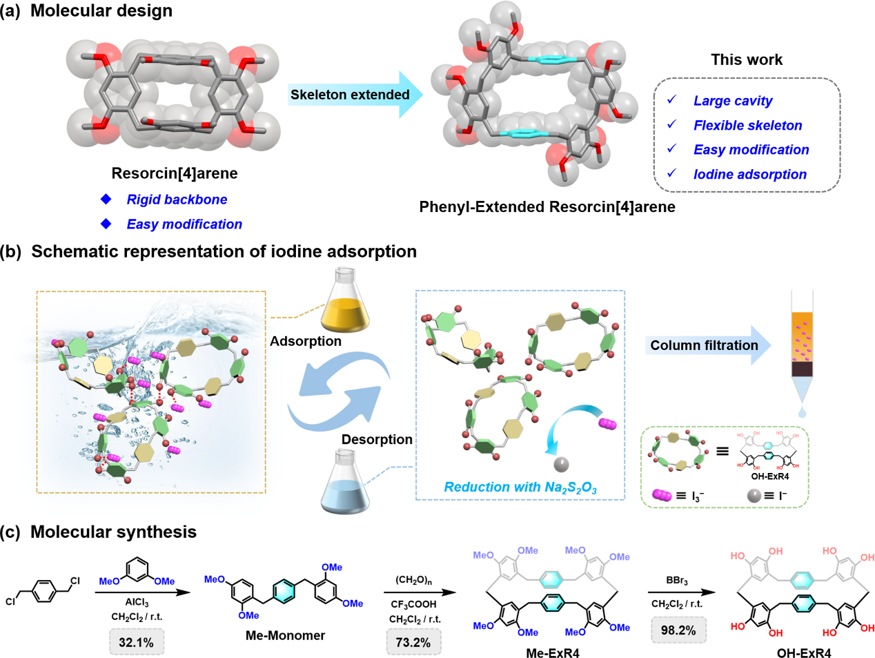 图1.(a)分子的设计;(b)水中碘吸附示意图;(c)大环分子及其衍生物的合成路线。