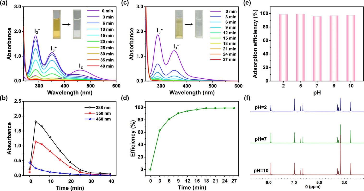 本工作中,ExR4的全羟基化衍生物OH-ExR4对水溶液中的碘三负离子(I3−)表现出了显著的吸附能力,能够达到1.18×10-2g·mg-1·min-1的动力学吸附速率,以及95%以上的吸附效率,这一性能优于许多现有的碘吸附材料。同时,OH-ExR4在酸性、中性以及碱性缓冲溶液中仍能够保持良好的稳定性以及较高的碘去除效率,且经过十次吸附-解吸循环后,其骨架稳定性以及吸附效率仍保持良好,这为其在实际应用奠定了基础。此外,对于碘吸附机理的探究结果表明,大环分子中的羟基基团与I3−之间的静电相互作用以及大量的分子间氢键的协同作用是吸附过程的关键所在。这一发现为未来设计更高效的碘吸附材料提供了重要指导。