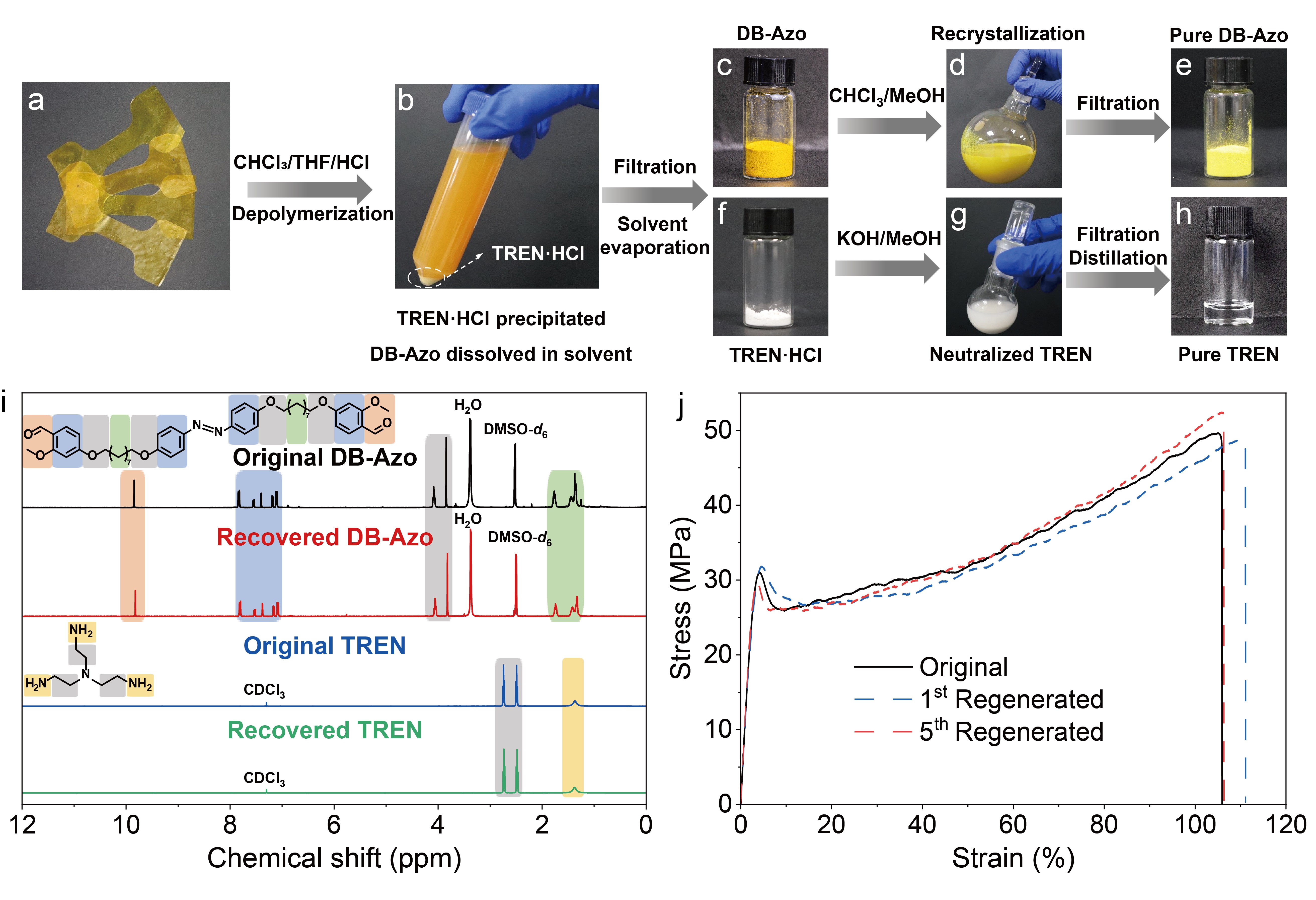 刘小孔教授课题组报道了可实现“聚合物到单体”闭环回收的室温编程动态液晶网络,并基于闭环回收实现了材料的彻底再生与液晶驱动器的功能更新。将含偶氮苯液晶基元的二苯甲醛单体(DB-Azo)与三胺单体(TREN)经席夫碱反应缩聚,制备得到了动态亚胺键作为交联点的Azo-DCv-LCN。利用亚胺键的水致动态性,Azo-DCv-LCN可通过水中浸泡后拉伸实现室温编程,获得光响应液晶驱动器。将驱动器的光驱动行为与聚合物网络的形状记忆性质相结合,实现了驱动器复杂化与多样化的形态操控。重要的是,利用亚胺键在酸催化下的水解特性,Azo-DCv-LCN可在室温下实现解聚和两个单体的分离与高效率、高纯度回收,回收的单体可用于制备全新的Azo-DCv-LCN,实现了材料的彻底再生与性能恢复。在回收再制备过程中,可方便地去除原填料并引入新的功能填料,不仅使驱动器彻底再生,同时实现了功能更新,对于液晶驱动器经济价值的循环与升级具有重要意义。该工作以题为“Closed-Loop Recyclable and Totally Renewable Liquid Crystal Networks with Room-Temperature Programmability and Reconfigurable Functionalities”的文章发表于Angewandte Chemie International Edition上。