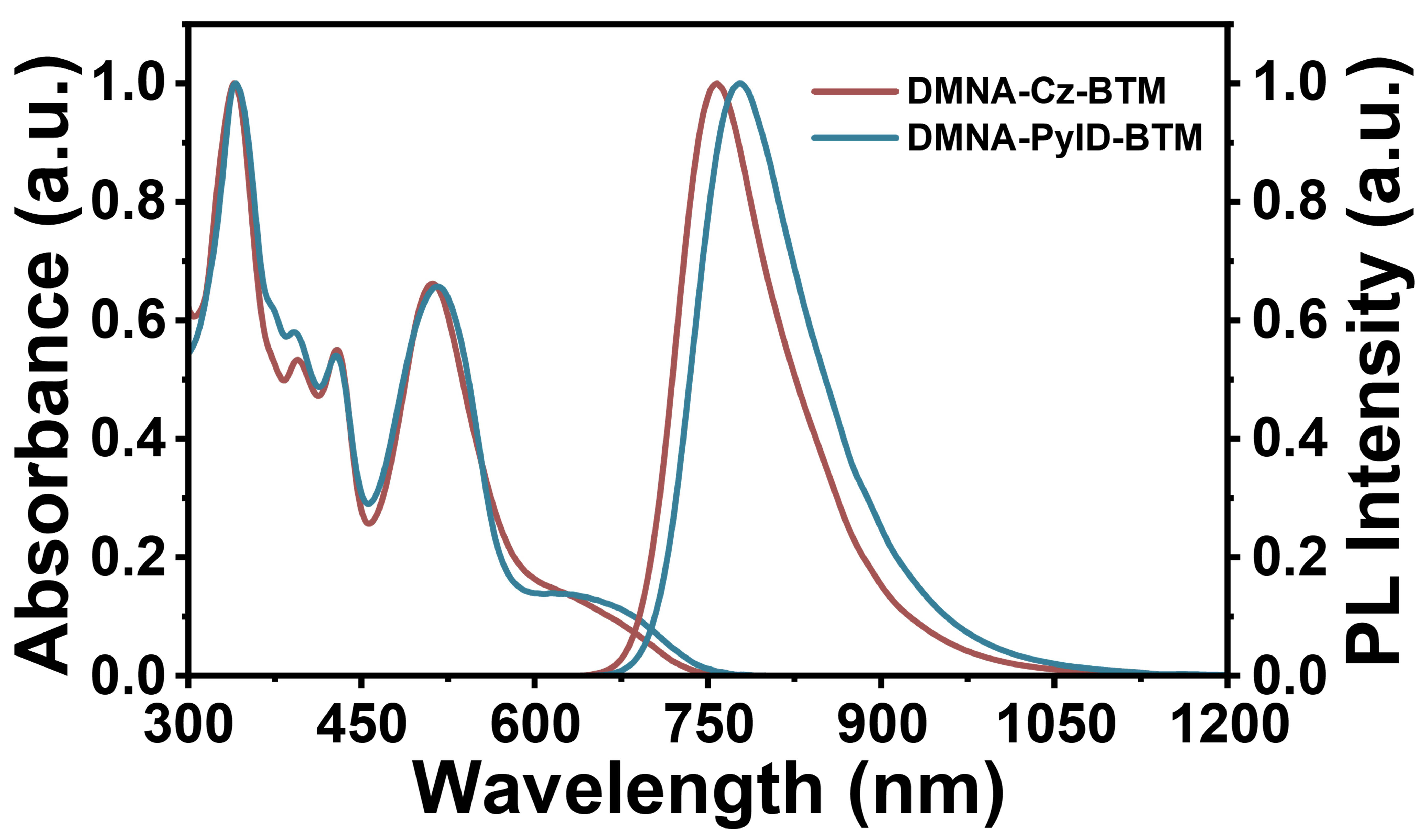 在甲苯稀溶液中,DMNA-Cz-BTM(λem= 758 nm, PLQE = 55%)和DMNA-PyID-BTM(λem= 778 nm, PLQE = 66%)均显示出峰值波长超过750 nm的高效近红外发射。光物理分析表明DMNA-Cz-BTM和DMNA-PyID-BTM的高效发光源于其非辐射跃迁被有效抑制。