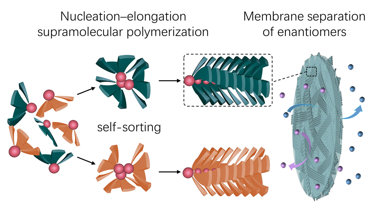 图3.伴随手性自分类的簇基单体的成核–延伸生长聚合过程及其渗透膜对映体分离研究示意图