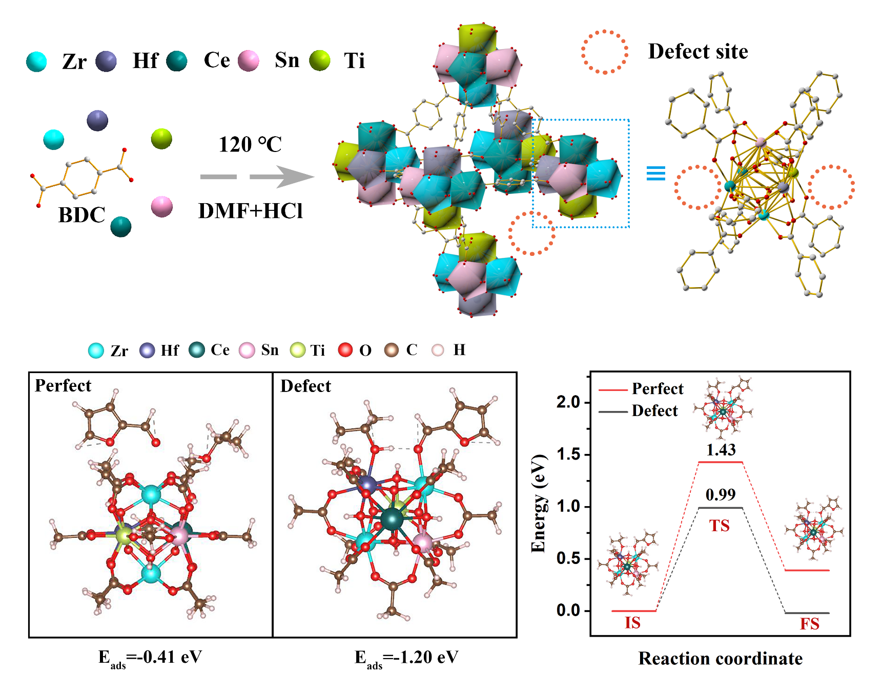 田戈副教授课题组首次合成了高熵、缺陷丰富且粒径较小(32 nm)的UiO-66型MOF(ZrHfCeSnTi HE-UiO-66),并通过增加构型熵提高其对多种金属离子掺杂的耐受性。该高熵材料的晶格畸变导致金属节点暴露度显著增加,从而生成了配位不饱和金属位点,浓度达到322.4 μmol/g,显著提高了路易斯酸碱位点的丰富性,进而提升了其在催化转移加氢(CTH)反应中的催化性能。实验结果和理论计算都证实了配位不饱和位点的存在有效地调节了HE-UiO-66的电子结构,增强了其与底物分子的相互作用和结合,有效降低了氢转移过程的能量势垒。同位素标记质谱法证实了CTH反应路径。构象熵的增加促进了HE-UiO-66的物理化学性质(尺寸、稳定性、缺陷、配位不饱和位点和路易斯酸碱性质)的改善。该研究为构建MOFs中的配位不饱和金属位点提供了一种新策略,为MOF材料功能化的扩展提供了前景。相关研究成果发表在Nat.Comm.杂志(Nat.Commun.2025, 16, 367)。