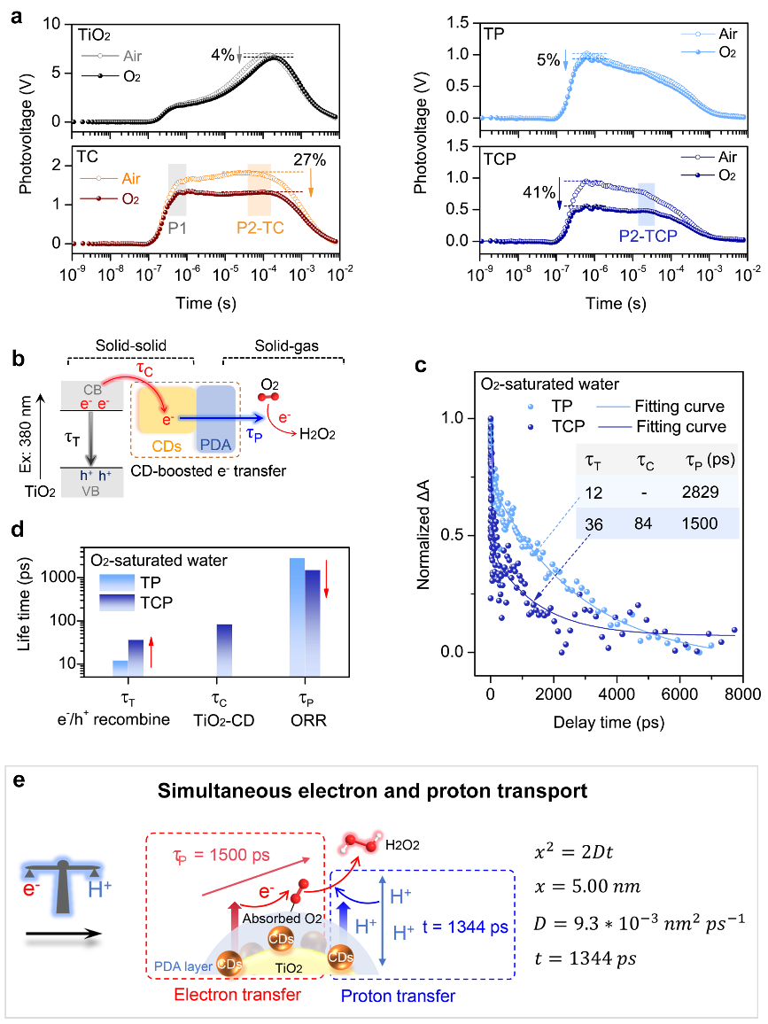 在该催化体系中,各组分功能明确且协同互补:TiO2核产生并提供光生载流子,PDA外壳则充当高效的氧化还原介质,特异性地捕获并还原O2分子。尤其值得关注的是,CD中间层发挥了双重关键作用:其不仅能够有效调控TiO2/CD/PDA界面的局部pH环境,还能促进质子与光生电子的协同转移,实现两者优异的动力学匹配,从而保证了O2双电子还原过程的高选择性。得益于CD的独特物理化学性质,该体系成功突破了传统催化剂中质子供给作为限速步骤的瓶颈;因此,光生电子可以基于上述结构设计由TiO2向PDA壳层快速定向迁移并高效参与氧气还原反应。这种卓越的光生电子利用效率通过原位瞬态表面光电压(in-situ TPV)技术得到了充分验证。本研究不仅为PCET依赖型光催化剂的设计提供了全新思路,还进一步强调了质子在光催化氧气还原过程中的关键作用,为构建光催化剂局部酸性行为的理论框架提供了重要依据。