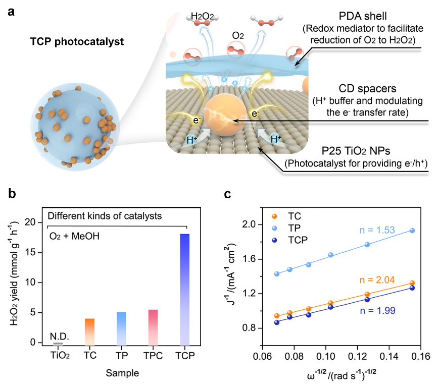 图1. (a) TiO2@CD@PDA(TCP)复合光催化剂中各组分功能的示意图。(b, c)不同光催化剂还原O2生成H2O2的反应活性。