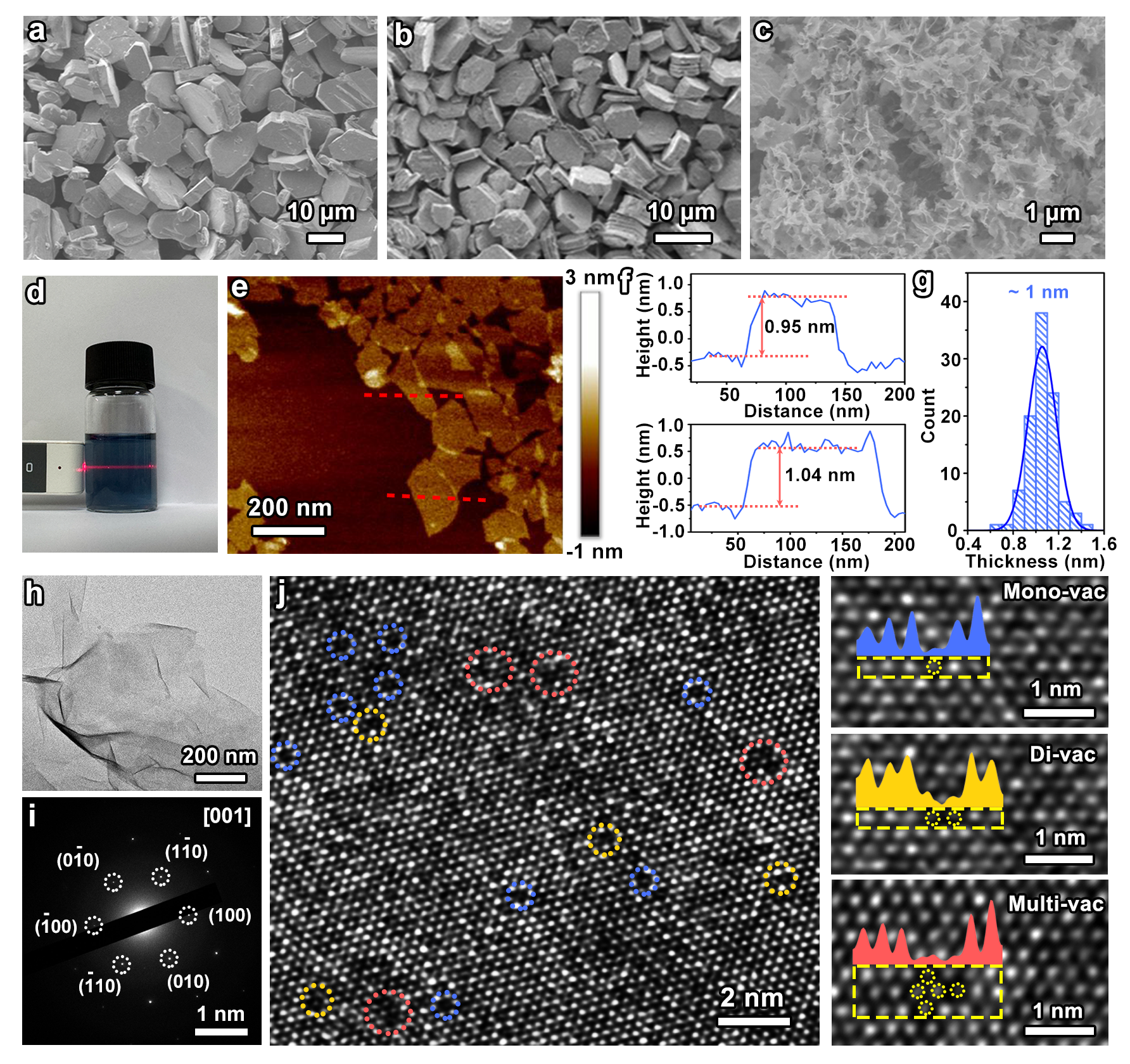 本研究首先采用固相合成法制备了层状铱基氧化物K0.5(Na0.2Ir0.8)O2,并以此作为前驱体,通过质子交换和机械剥离处理得到了具有本征原子缺陷的、厚度约1nm的氧化铱纳米片(图2)。研究发现,该纳米片面内丰富的缺陷结构不仅优化了边缘铱位点的活性,还激活了本征惰性的面内铱位点,显著提升了整体催化性能。
