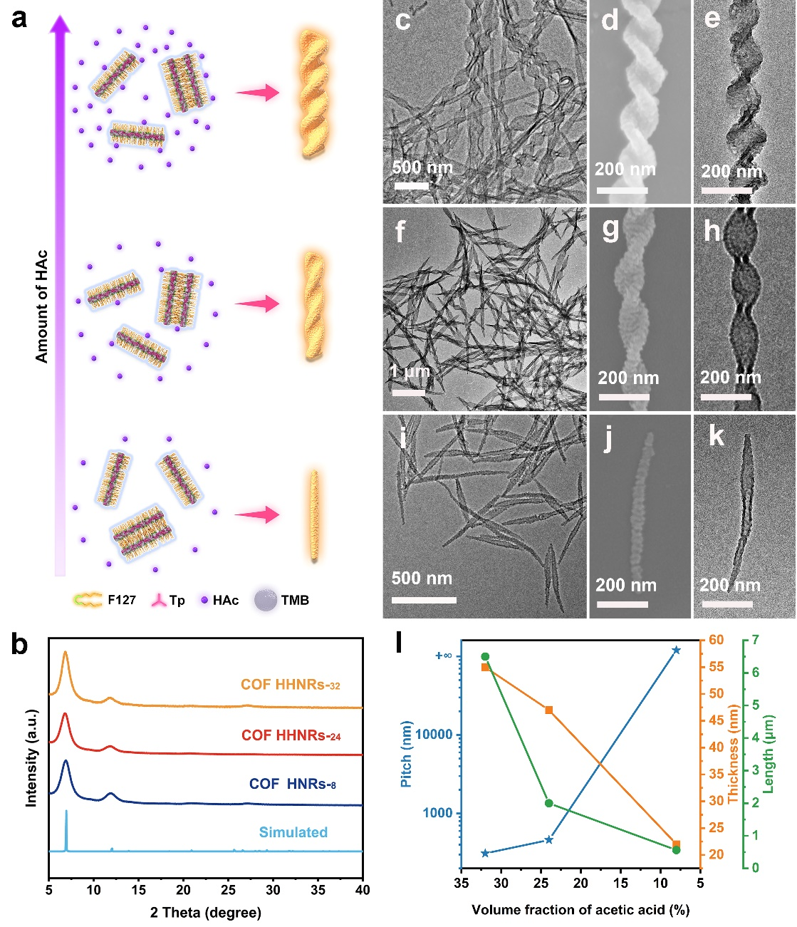 图2.通过调节乙酸体积分数精确调控COF螺旋纳米结构的螺距。