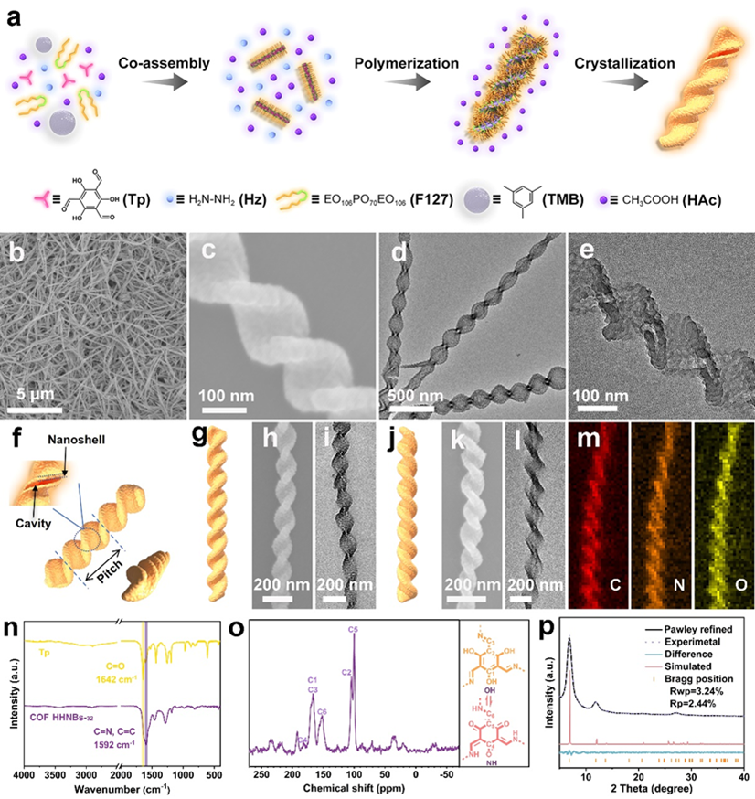 该胶束辅助自组装策略具体包括:以Pluronic F127为模板,1,3,5-三甲基苯(TMB)为胶束膨胀剂,1,3,5-三甲酰基间苯三酚(Tp)与水合肼(Hz)为COF构建单元,在室温下合成非晶态共价有机聚合物螺旋纳米带(COP HNRs)。随后,在120℃ 下经溶剂热处理实现结晶转化,获得具有螺旋空心结构的结晶态COF纳米带(COF HHNRs)(图1a)。扫描电子显微镜(SEM)和透射电子显微镜(TEM)图像显示,COF HHNRs具有中空结构,其表面伴有不规则颗粒形貌。能谱分析(EDX mapping)表明C、N、O元素分布均匀,进一步印证了材料结构的均一性。傅里叶变换红外光谱(FT-IR)及固态13C核磁共振(NMR)对COF HHNRs的化学结构进行表征,确认了COF骨架的成功构建。粉末X射线衍射(XRD)分析结果进一步证实了该材料的良好结晶性(图1)。