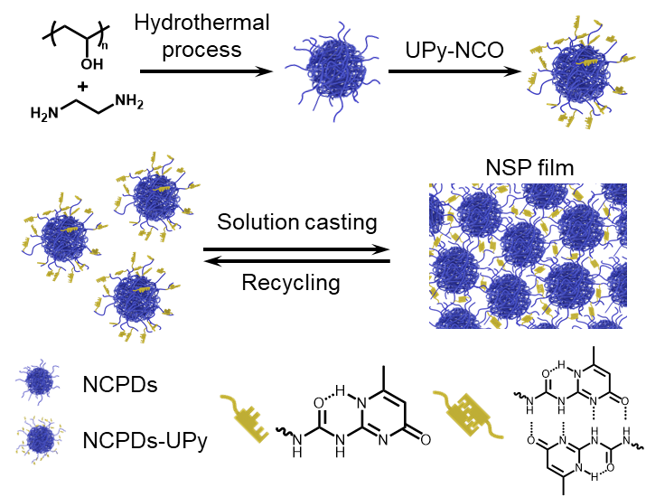 以聚乙烯醇和乙二胺为原料通过水热反应合成CPDs。随后利用UPy-NCO对CPDs进行修饰得到构筑基元,利用溶剂蒸发法制得超分子塑料。(图1)