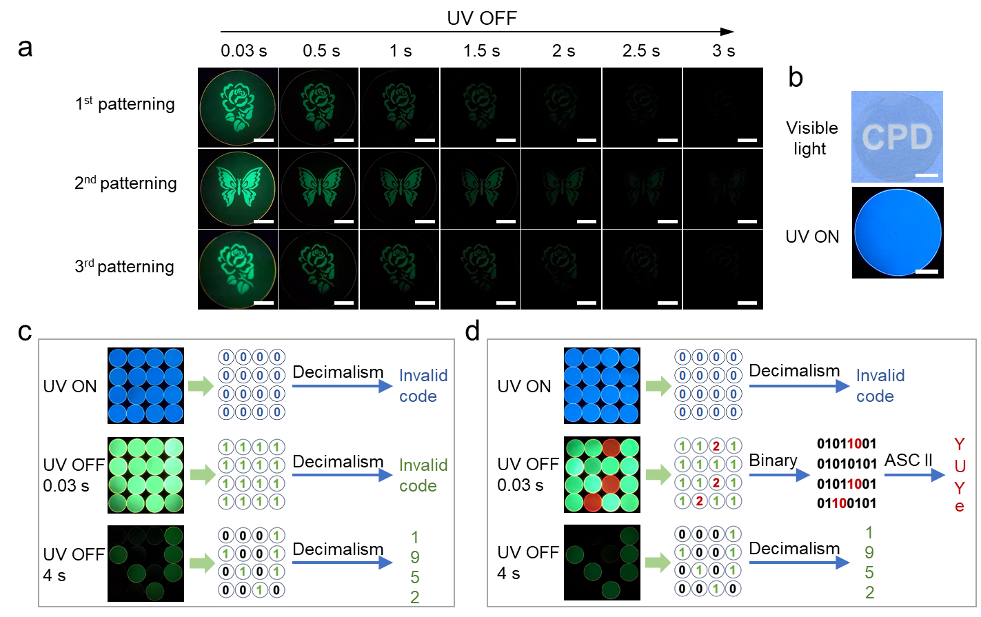 该NSPs材料具有良好的机械性能、独特的光活化室温磷光(RTP)和出色的溶剂稳定性。在几次回收后NSPs仍可以保持原有的机械性能和光活化的RTP性质。该工作展示了NSPs在高级信息安全中的概念验证应用。将有机分子掺入NSPs中,NSPs可以实现具有多种颜色的光活化RTP。由于NSPs的RTP寿命和发射颜色可调,NSPs显示了循环信息写入/擦除能力和具有时间分辨和时间-颜色分辨方式的加密和解密过程的高级信息加密系统(图2)。