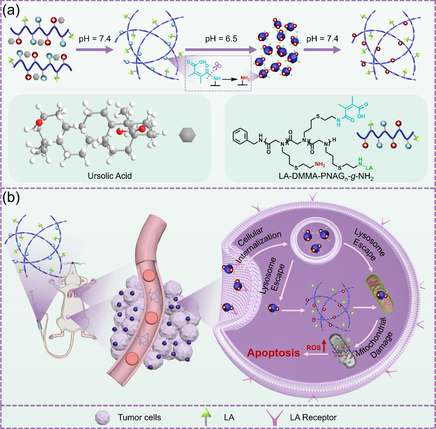 陈学思院士和孙静教授研究团队创新性地提出仿生递送策略(图1),设计开发了仿分子伴侣功能的生物活性聚类肽组装辅助因子,通过模拟生物大分子的精准组装过程,成功构建了具有pH响应特性的纳米纤维载药体系(图2),显著提升了UA的抗肿瘤疗效,为肿瘤靶向治疗提供了创新性解决方案。