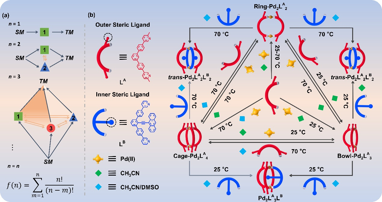 路径工程的核心在于对反应途径的设计与调控,旨在引导特定结构的合成。此方法被广泛用于化学合成、材料科学乃至生物系统之中,用以优化并指导复杂过程的进行。在超分子化学领域,路径工程不仅为构建超分子结构开辟了新的有效途径,而且当既定合成路径遭遇阻碍时,它还能提供备选方案,确保目标产物的顺利合成。尽管其意义非凡,但关于超分子组装中路径工程的报道却仍显稀缺。这主要归因于实现超分子路径工程的两大条件:一是组装过程须经中间体完成;二是这些中间体需具备相互转化的能力。然而,在传统的自组装工艺中,由于中间体稳定性不足,捕获并利用这些关键成分极具挑战。同时,不同结构间的相互转化过程往往导致混合物的产生。