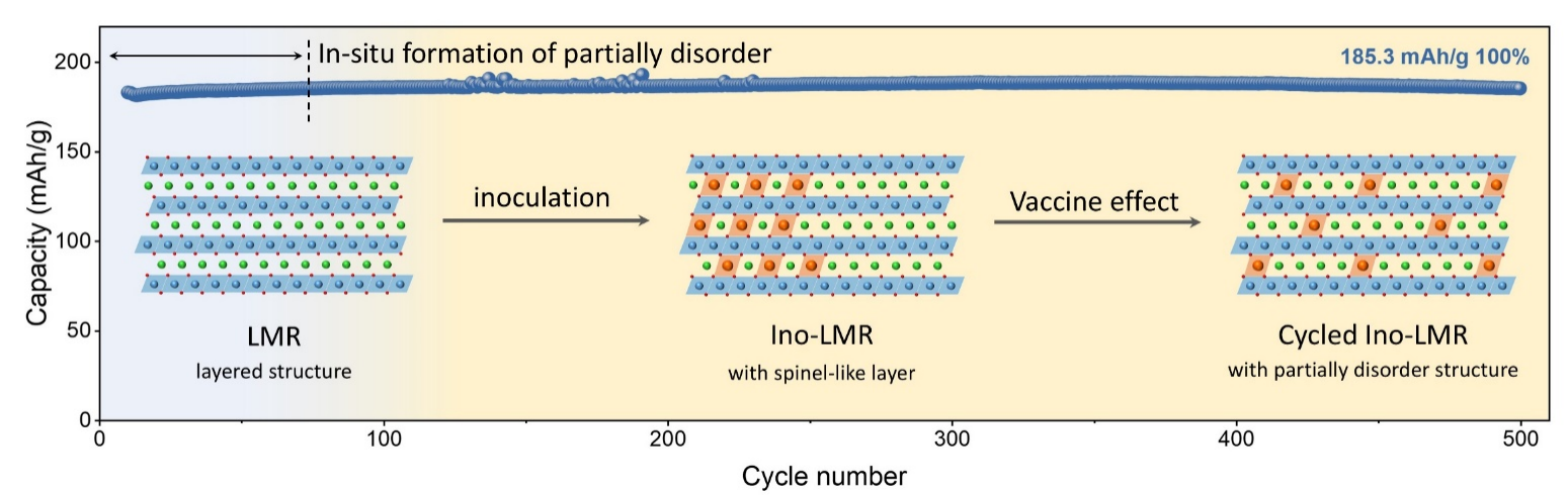 李莉萍教授团队在深入研究掺杂离子对层状氧化物正极影响的基础上,提出了一种在电化学循环过程中原位构建“部分无序”结构,以提升结构与电化学稳定性的策略。首先,采用熔盐离子交换法将Mg离子引入Li层,受限于固相反应动力学,Mg在初始合成阶段主要富集于晶粒表面。但在后续充放电过程中,Mg不断嵌入Li脱出后形成的空位,最终在Li层间均匀分布,形成类似“支柱”的结构,显著增强了材料在高脱锂状态下的稳定性。这种缓慢而可控的结构演化过程有效调节了层间相互作用,抑制了体相的结构坍塌。该过程中Mg离子的掺杂与演化如同疫苗在体内逐步建立免疫屏障,因此被形象地称为“疫苗效应”。此外,材料中还引入了Zr元素以增强M–O共价键,抑制高电压下晶格氧的流失,从而缓解结构破坏。通过结构支撑与稳定晶格氧的双重调控,实现了无钴富锂锰基正极材料在500圈循环内无容量衰减的超高稳定性,展示出优异的实用前景。