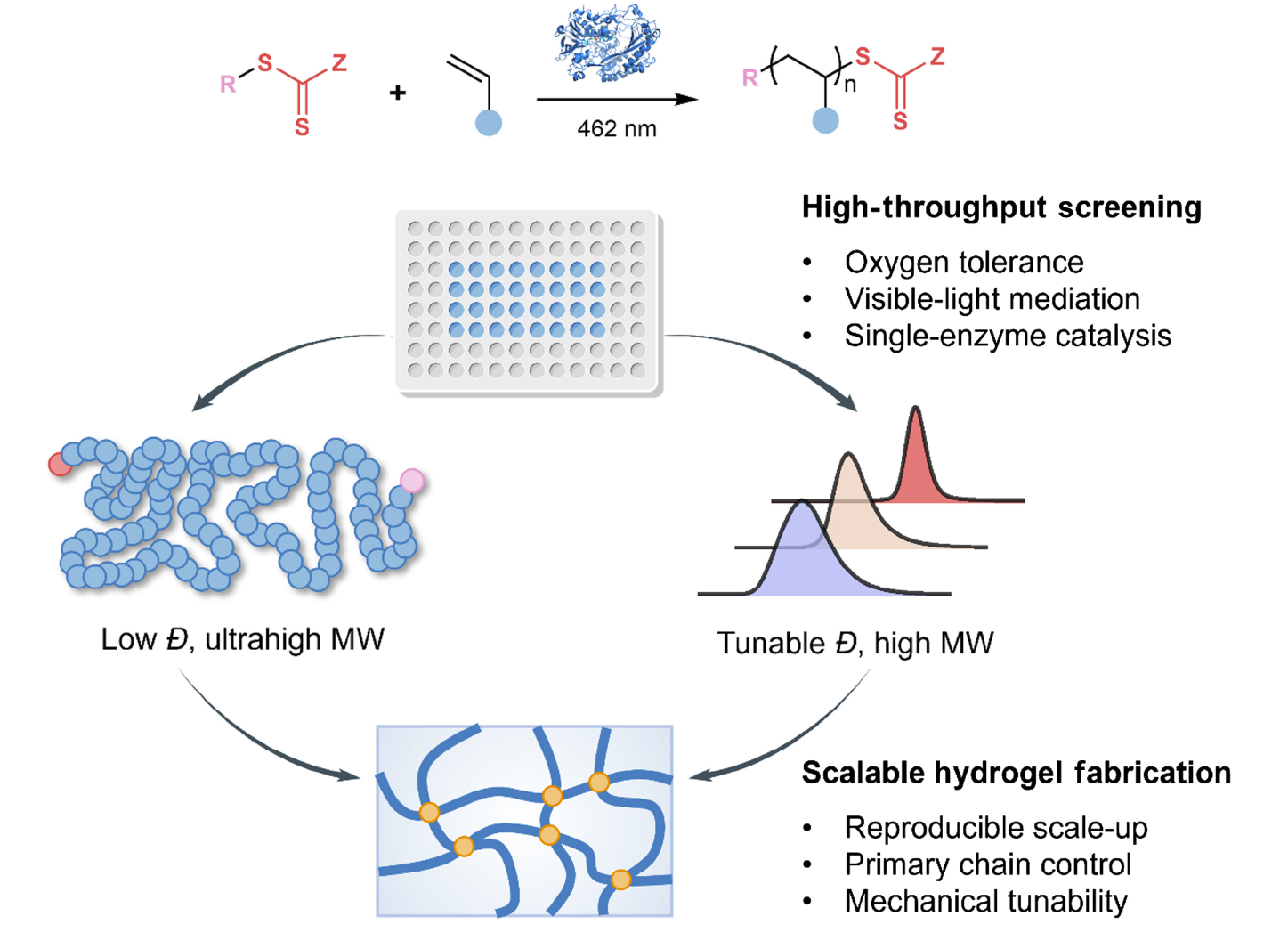 图1.高通量光酶RAFT聚合调控缠结网络聚合物分子量与分散度示意图